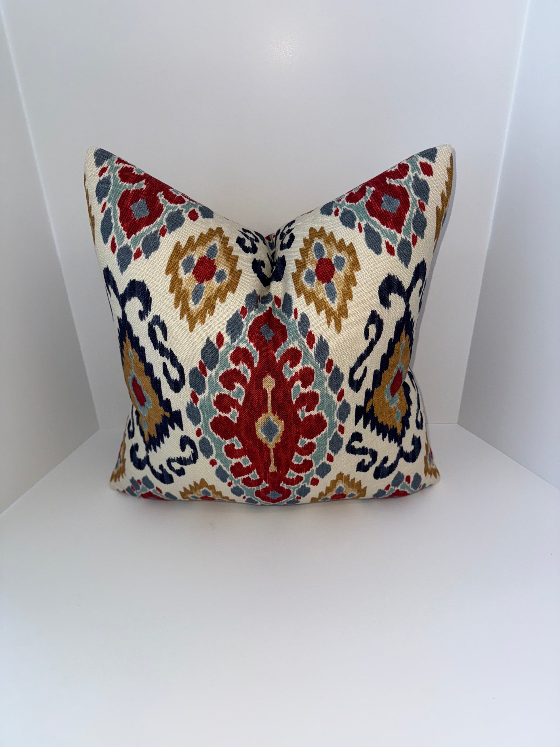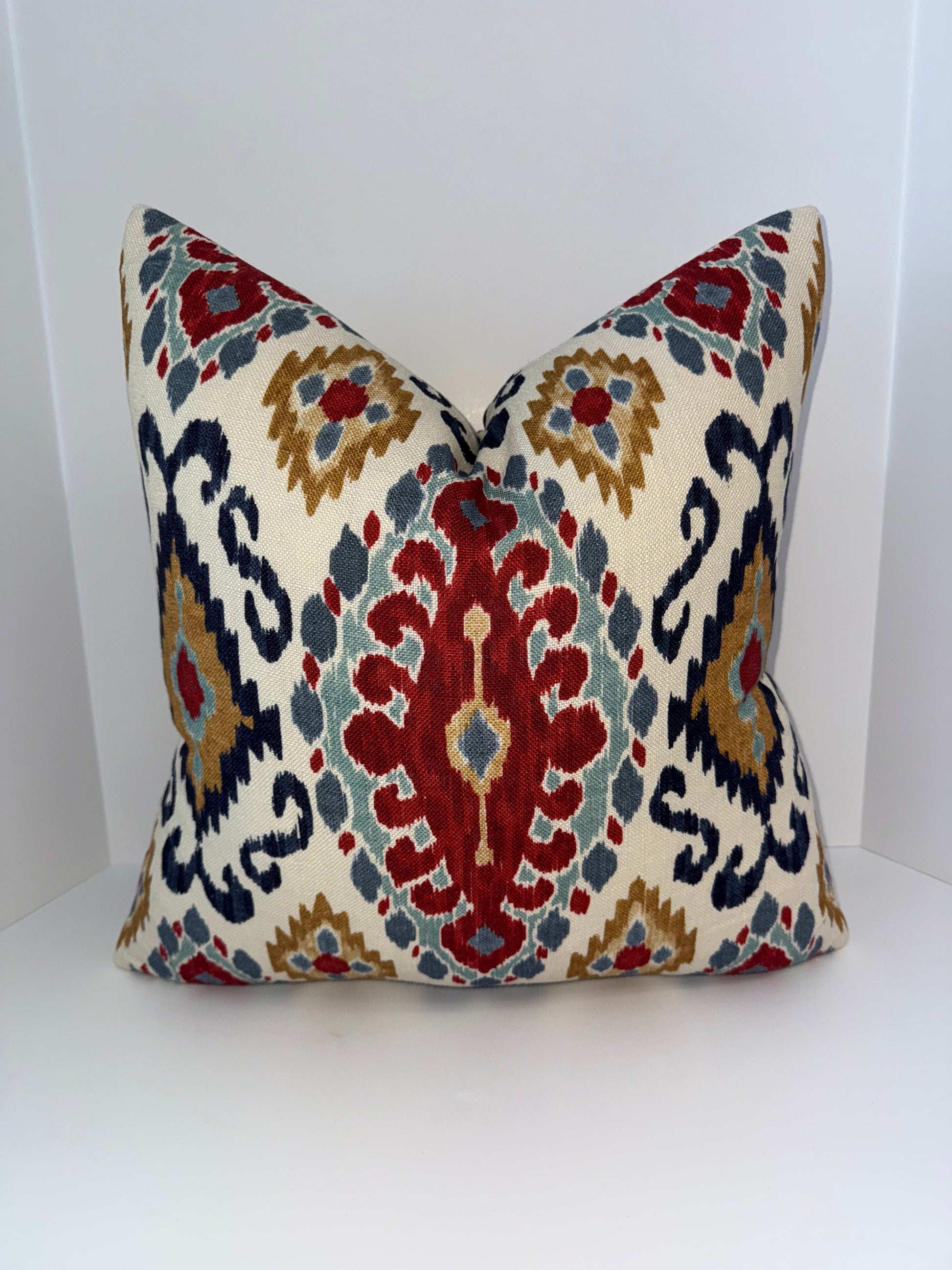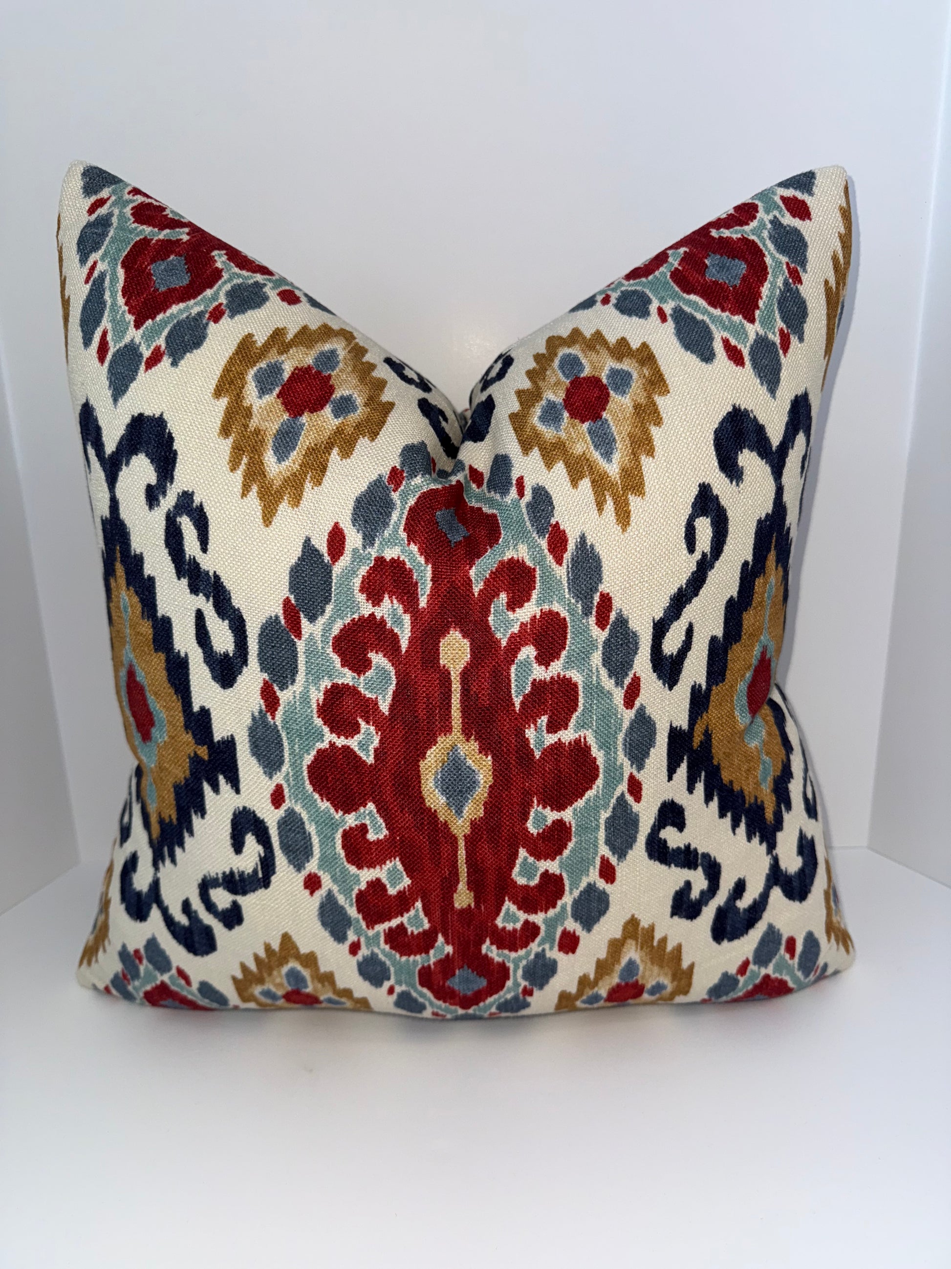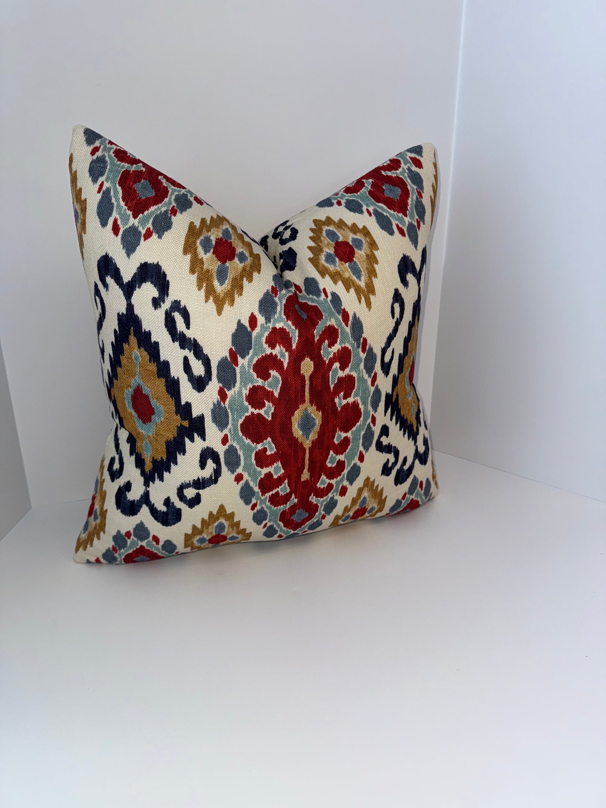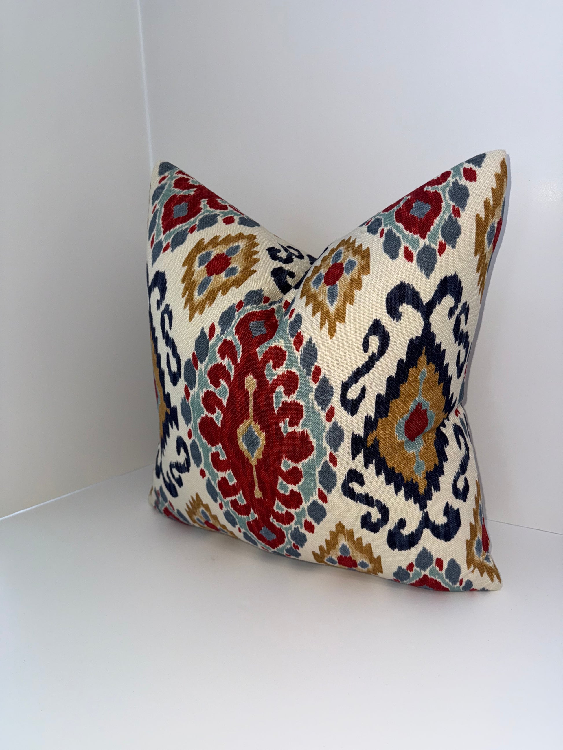 One 20x20 Blue, White, Red, and Gold Printed Linen Decorative Pillow