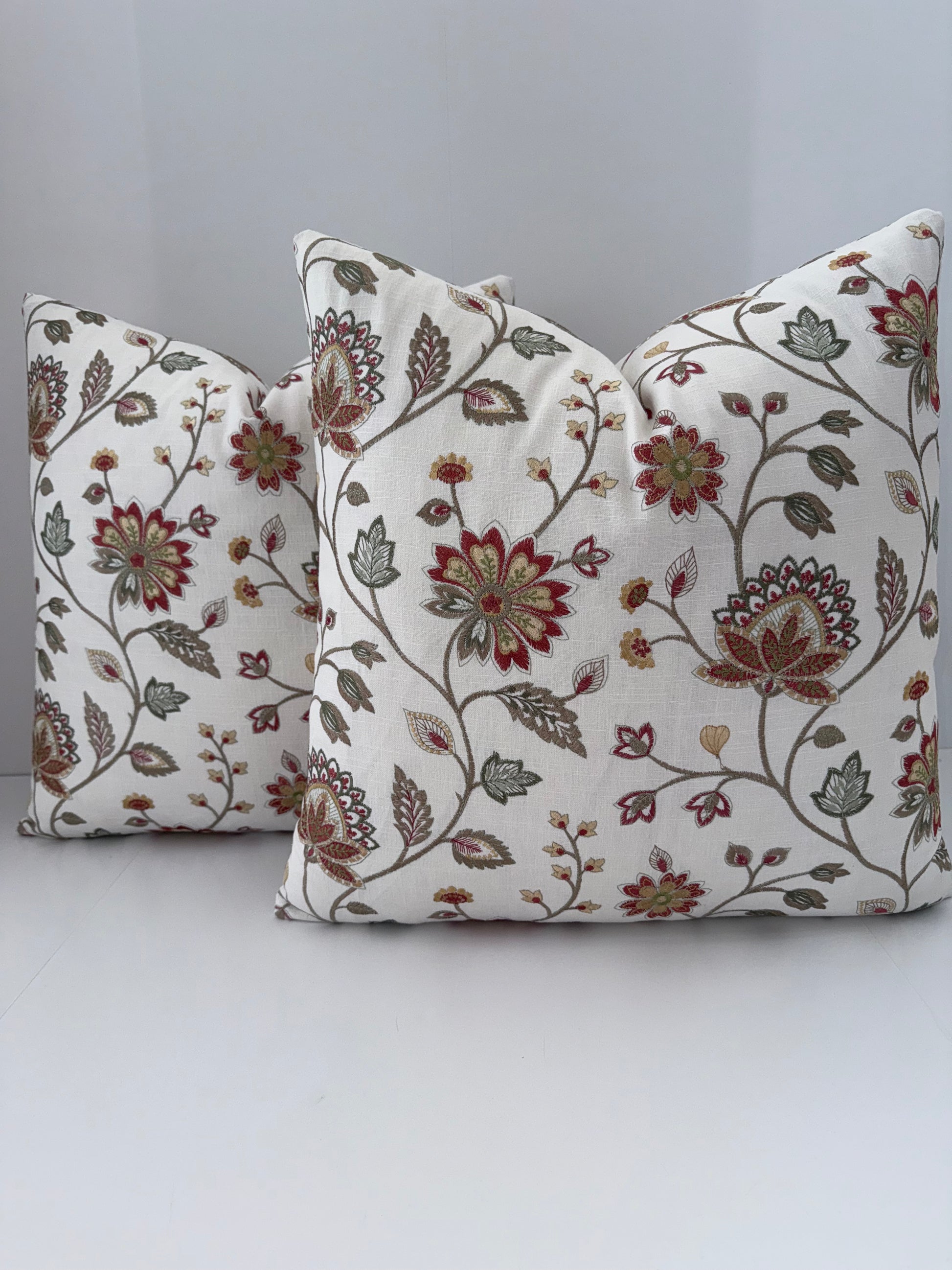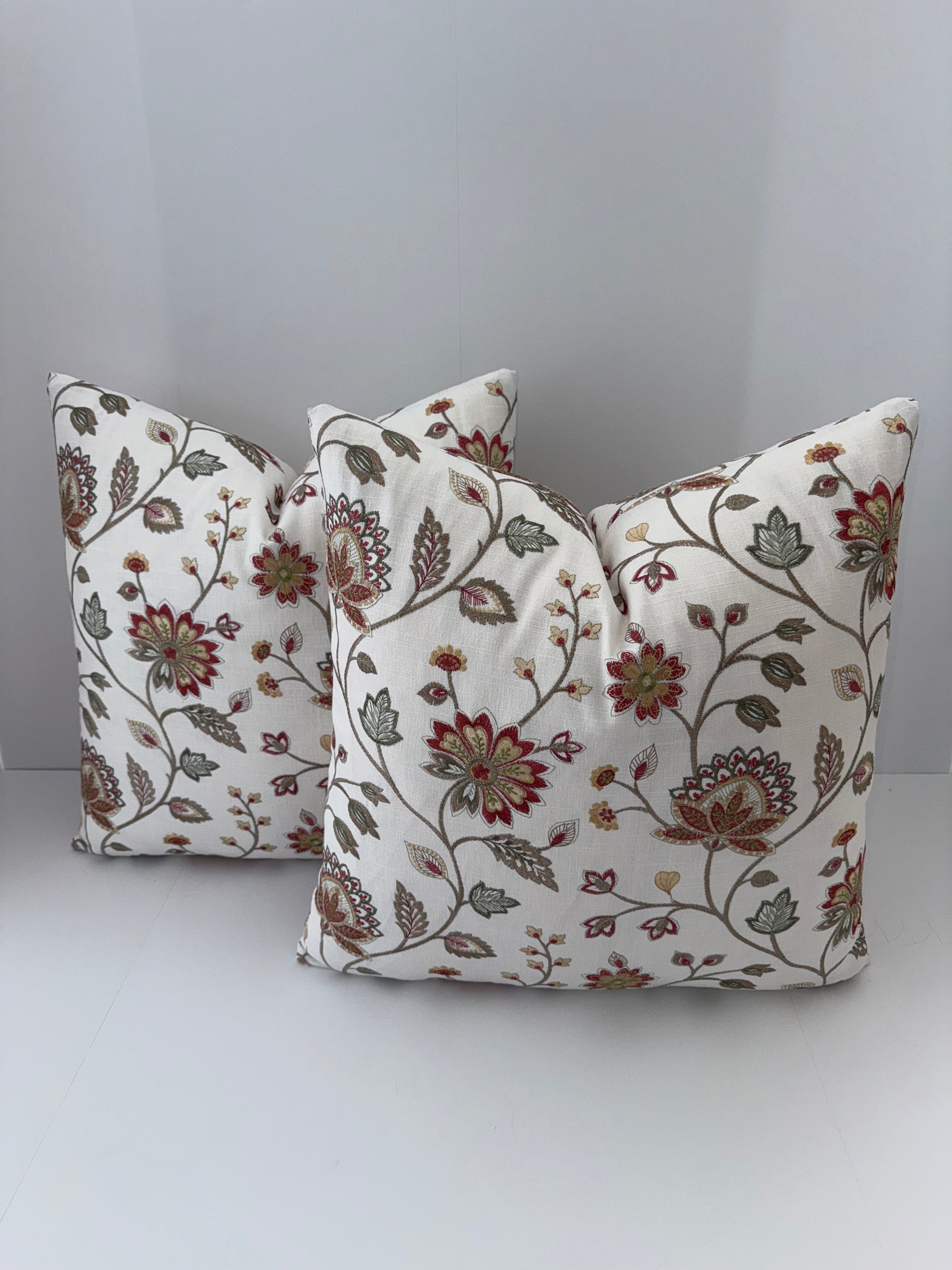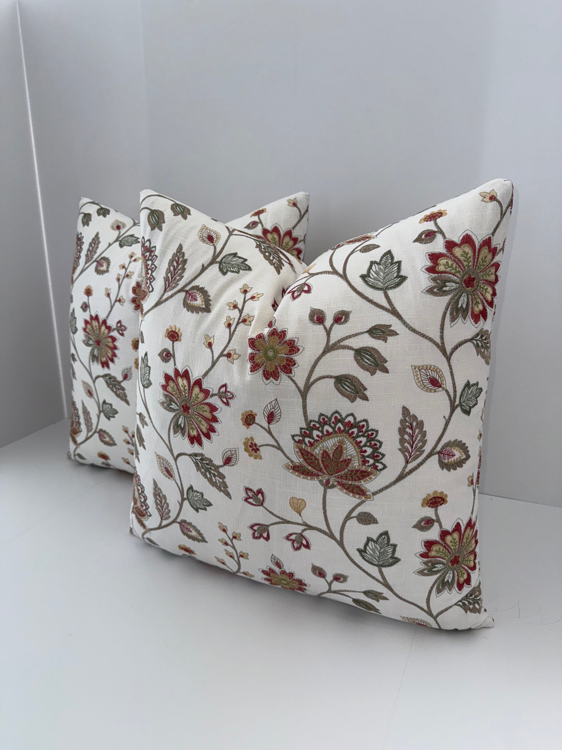 Two 22x22 White, Green, Red, and Yellow Embroidered Decorative Pillows