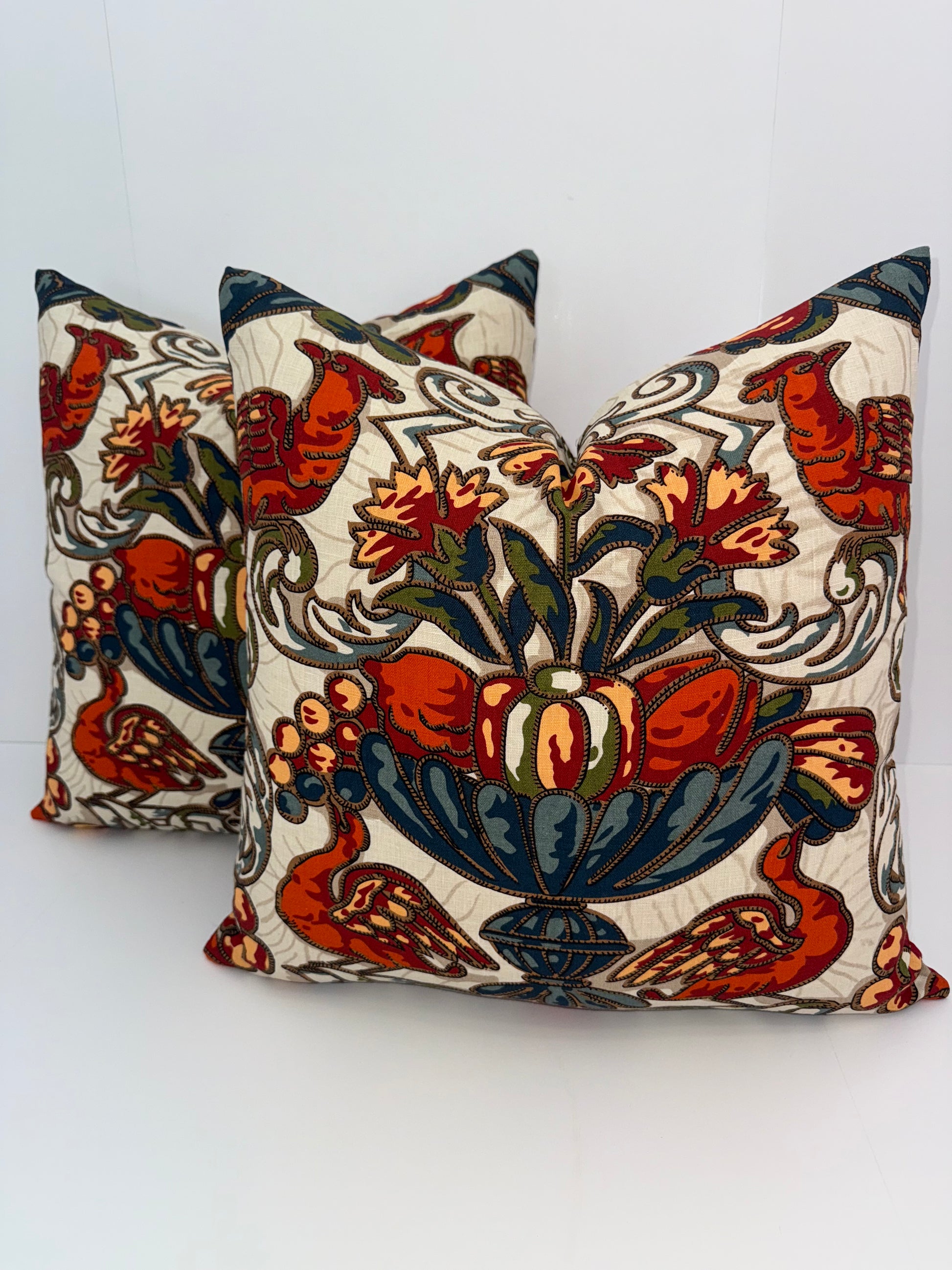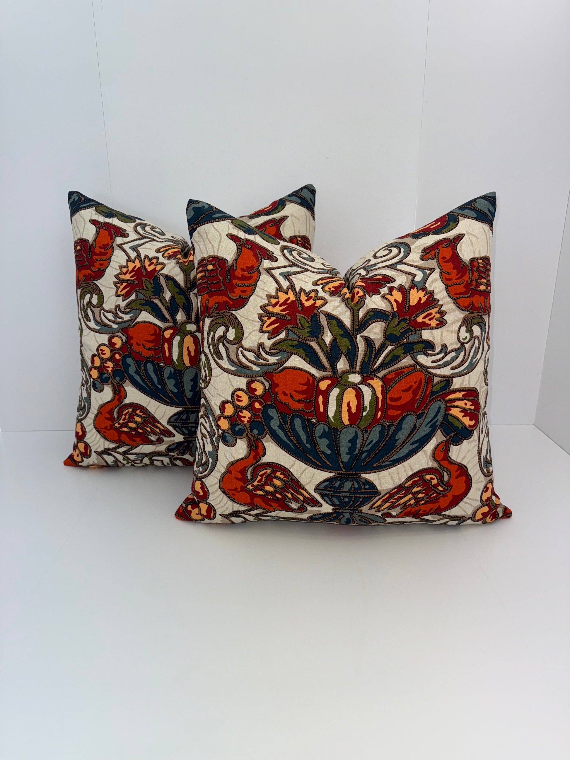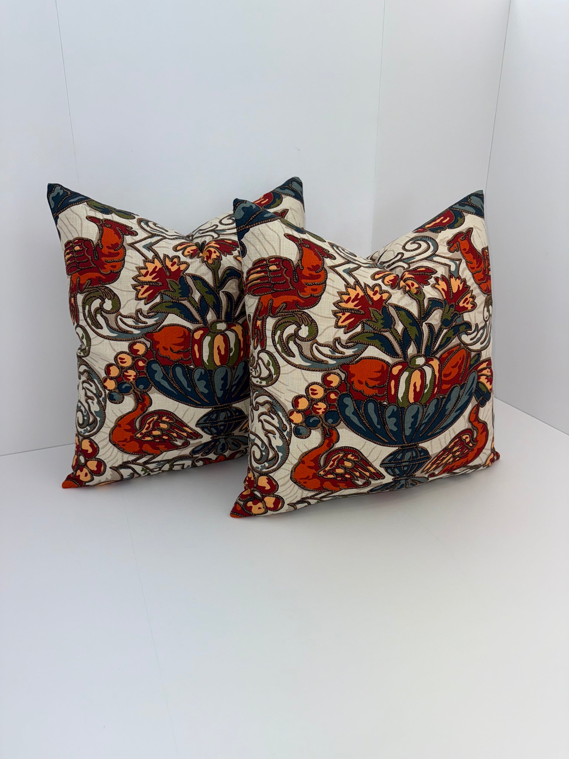 Two 22x22 Blue, Beige, Orange, Red, and Green Printed Linen Decorative Pillows