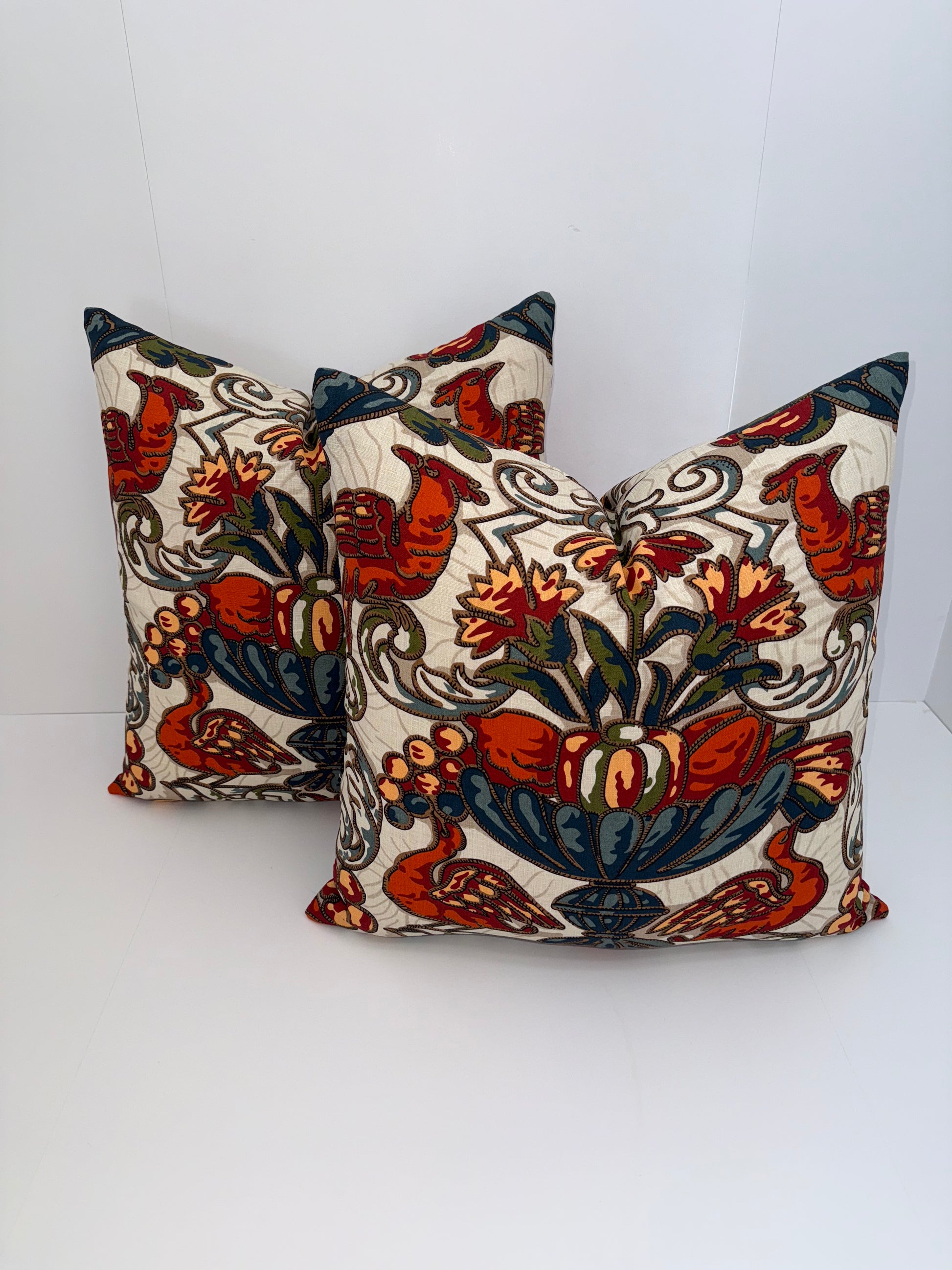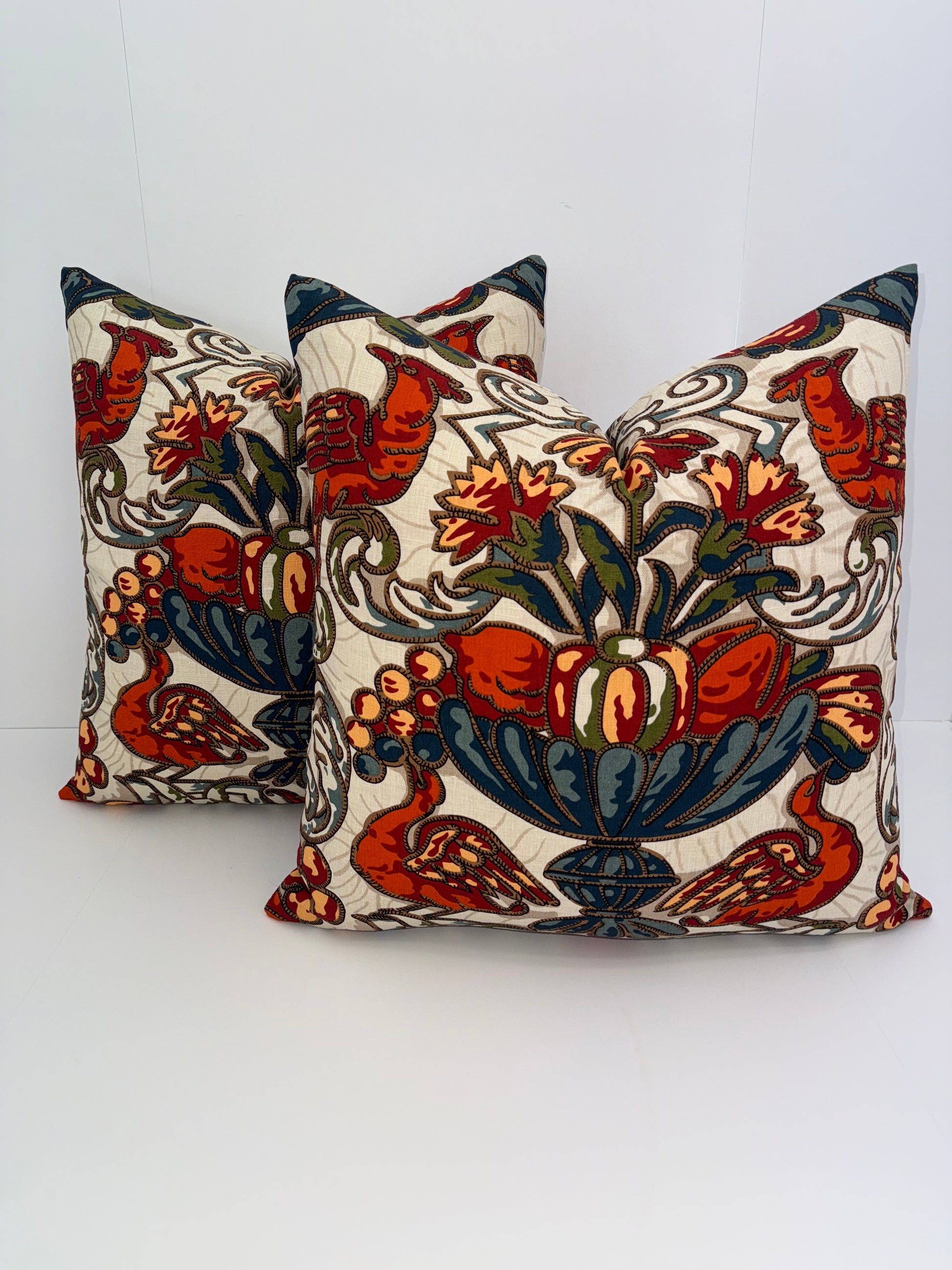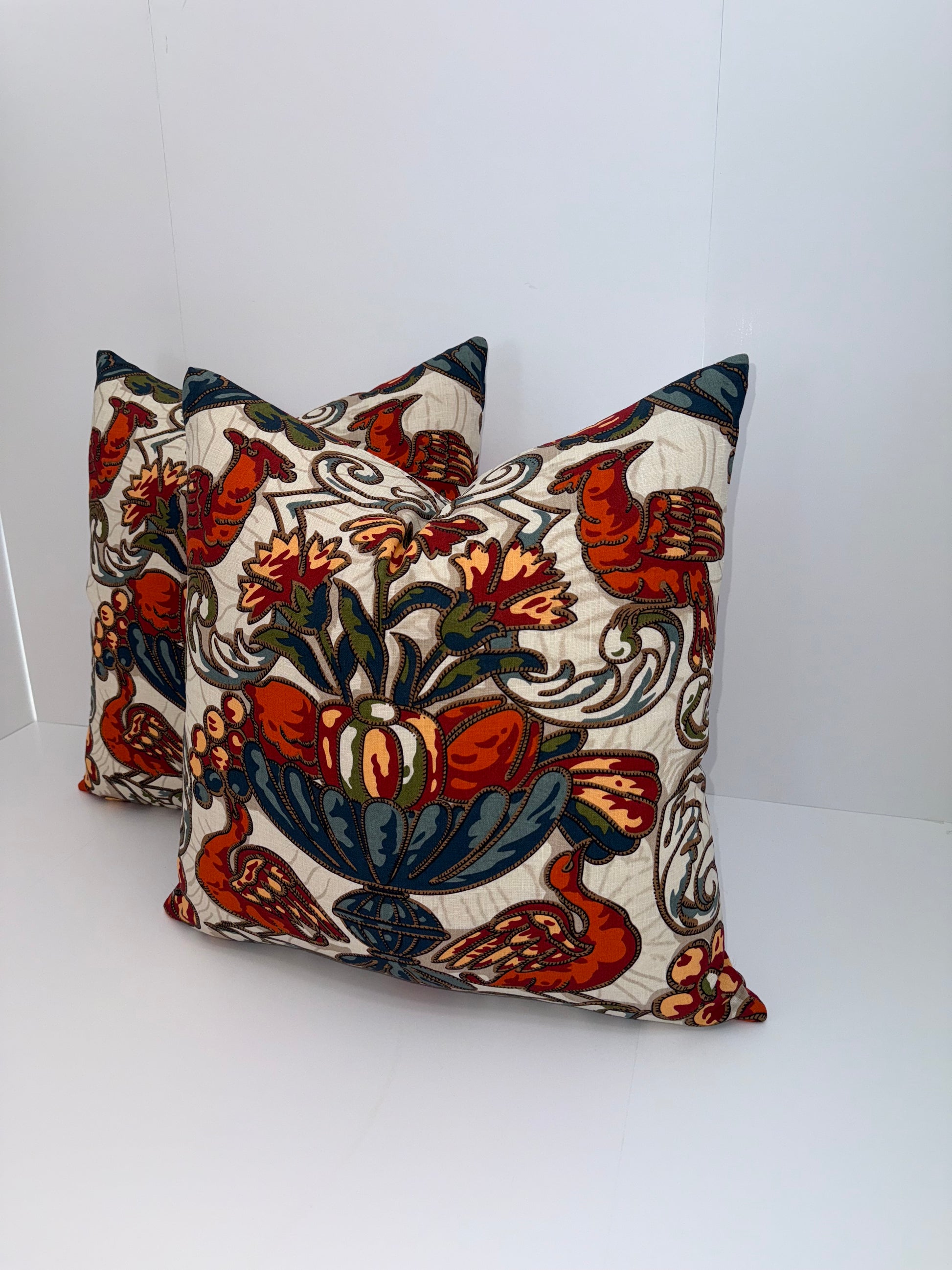 Two 22x22 Blue, Beige, Orange, Red, and Green Printed Linen Decorative Pillows