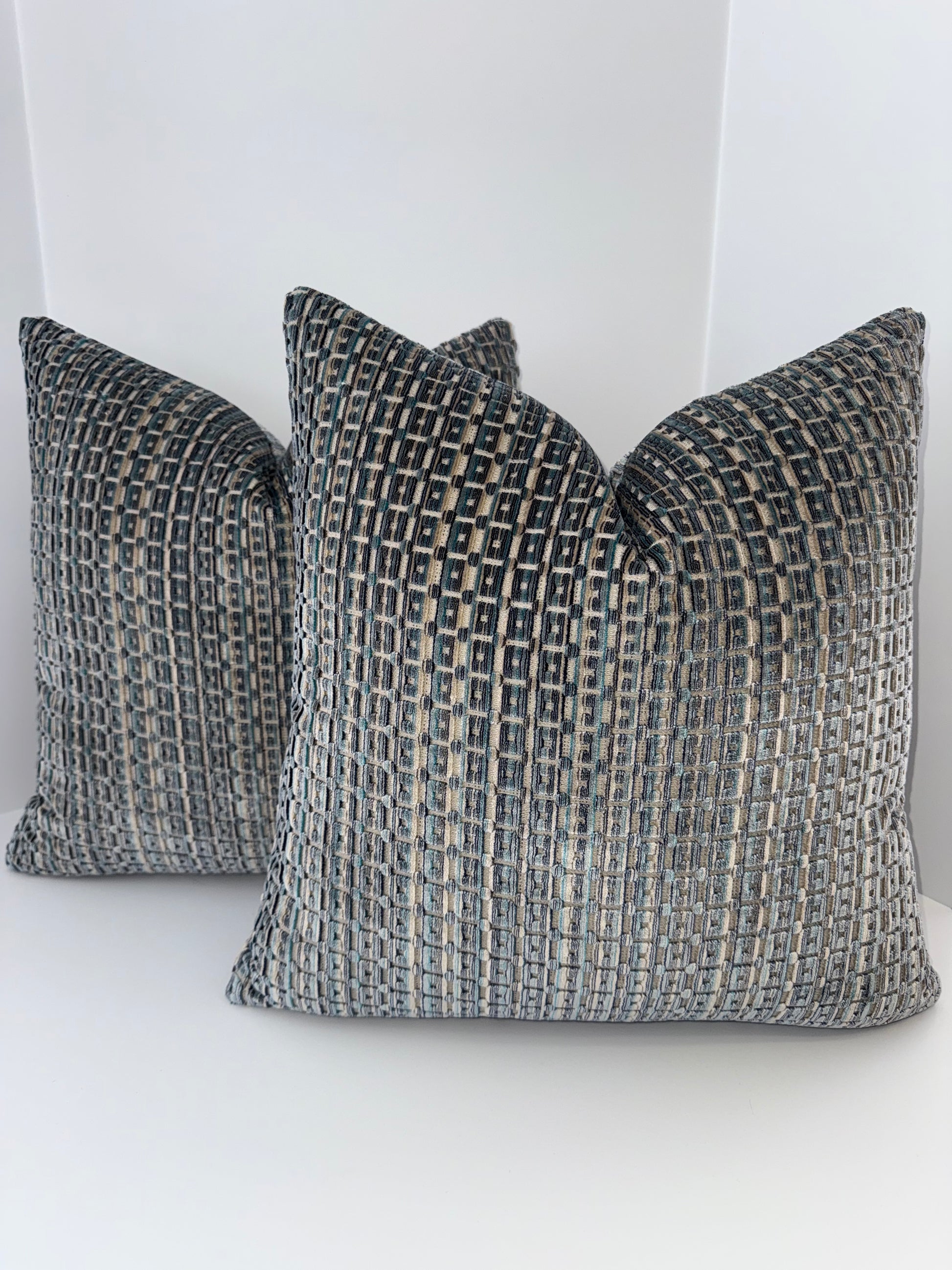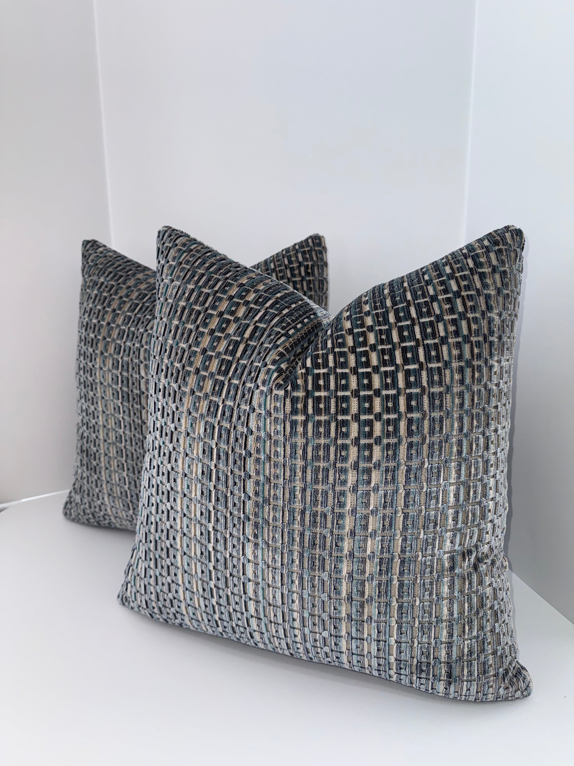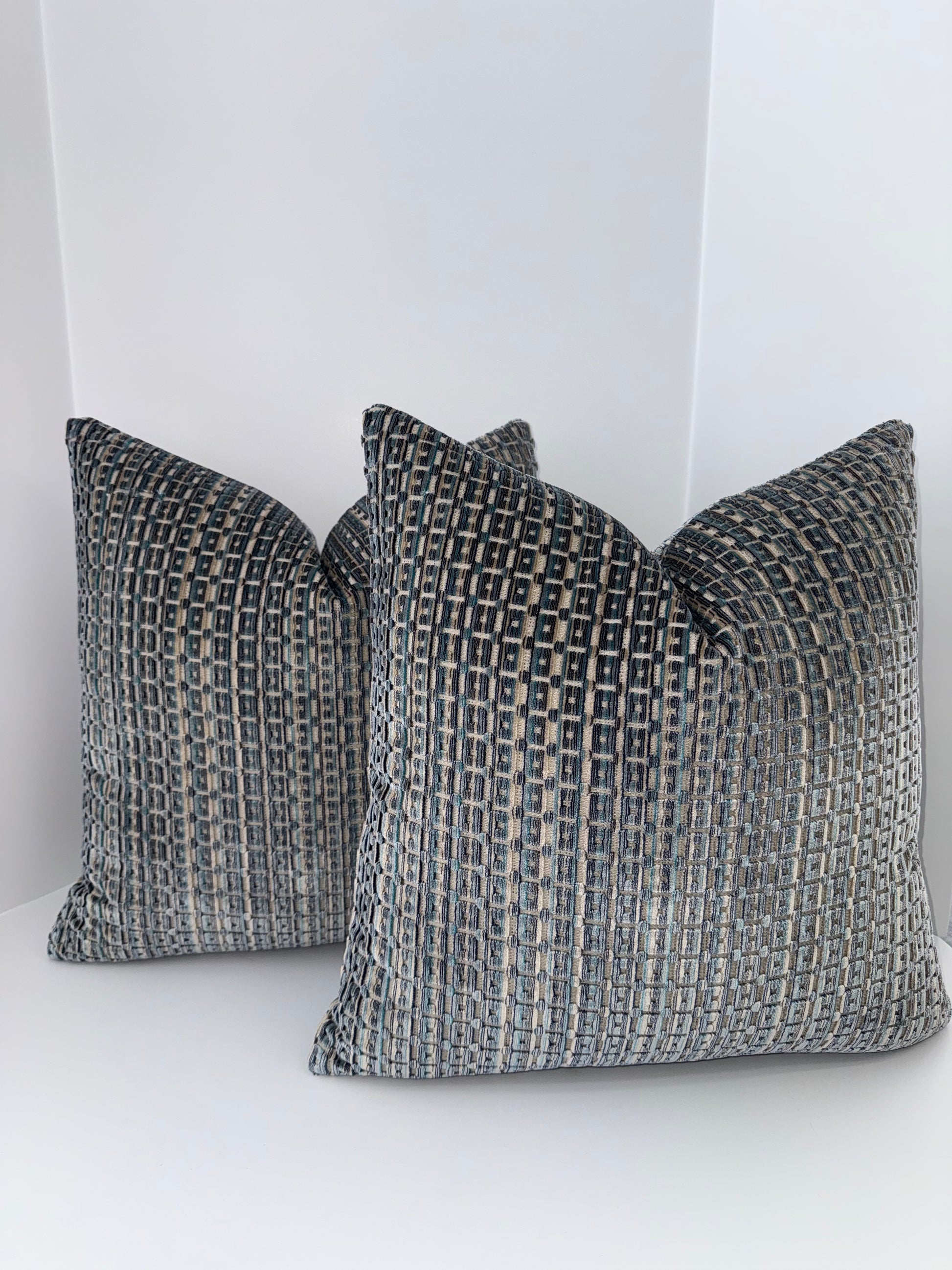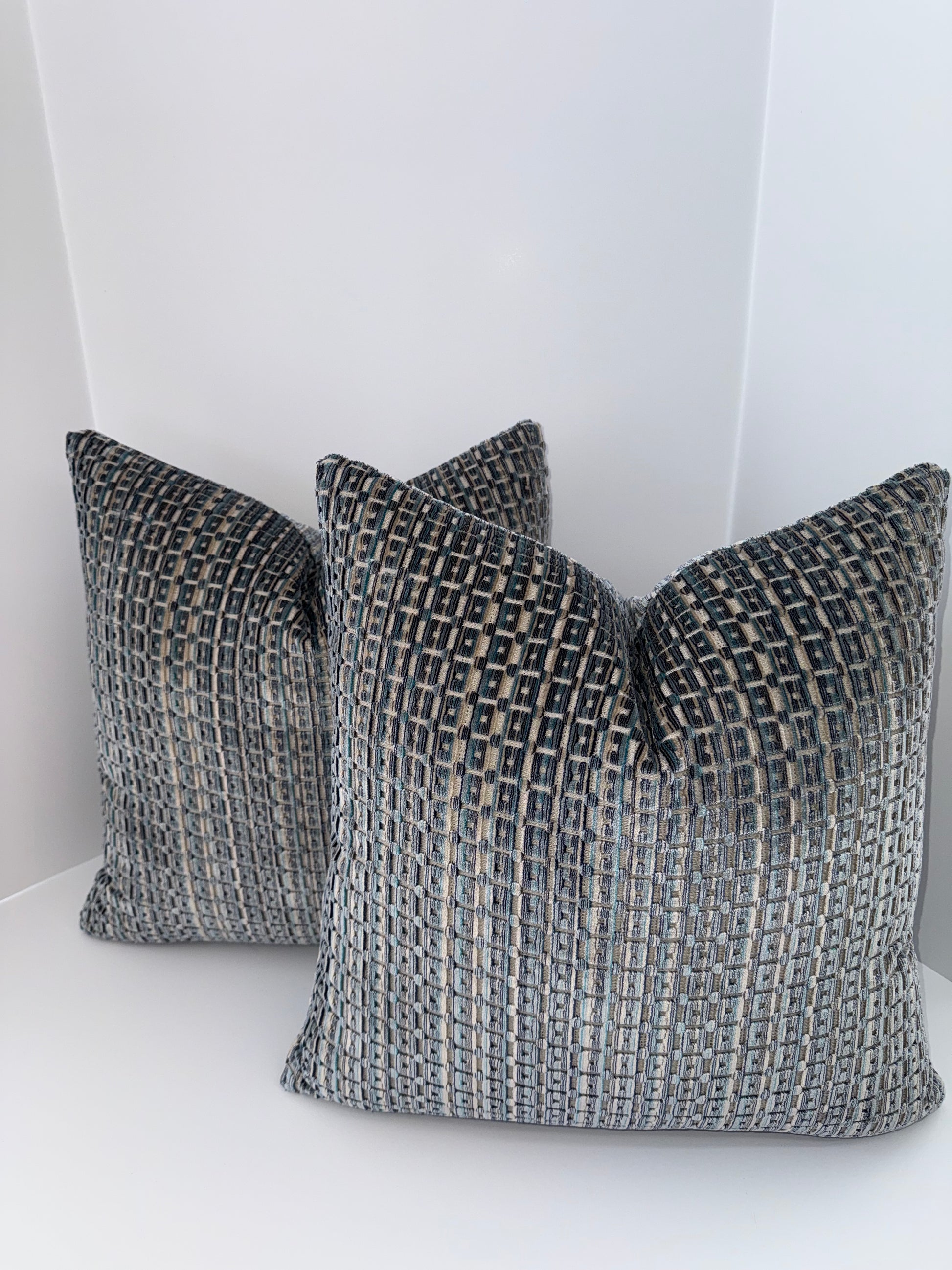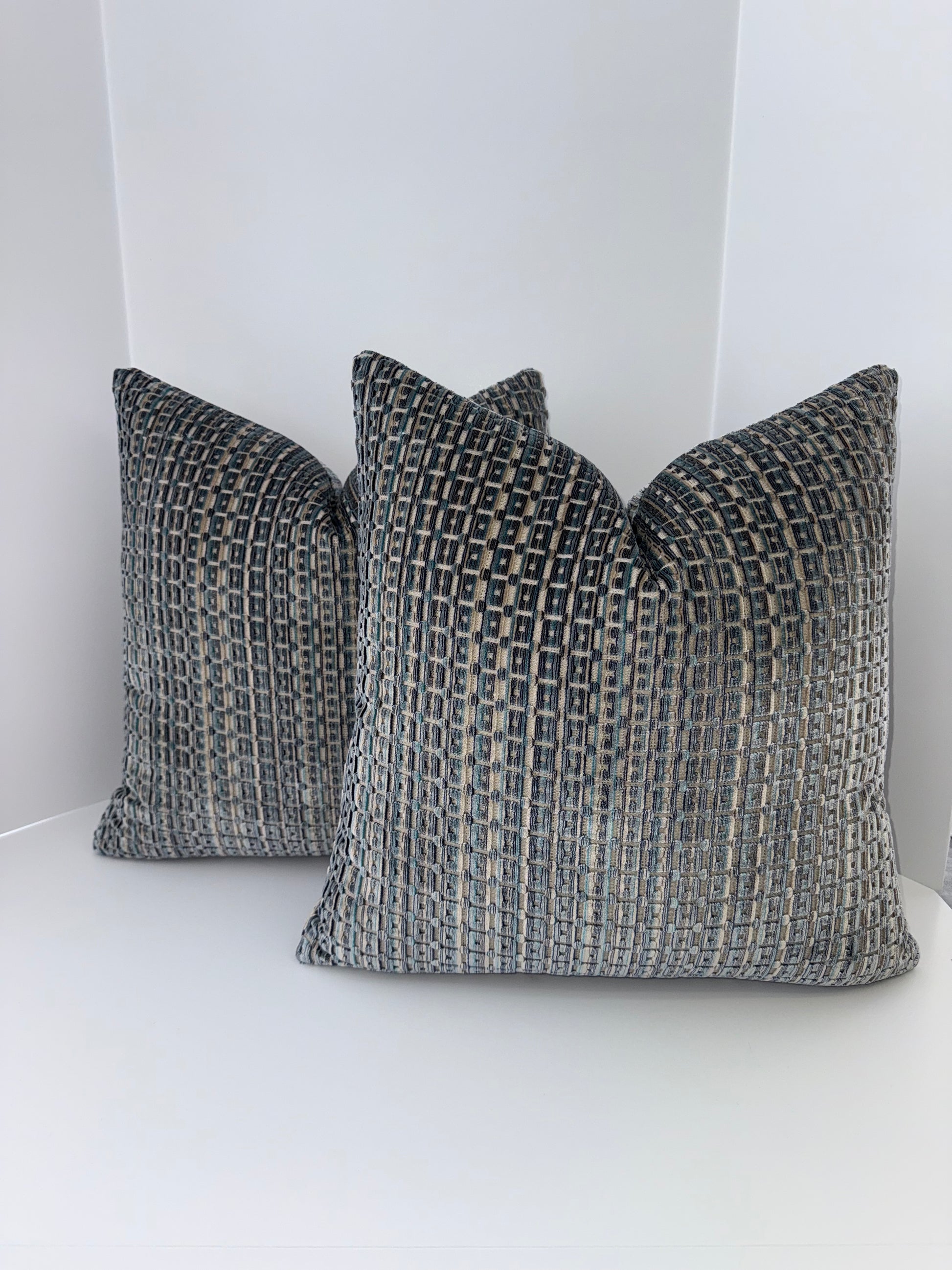 Two 20x20 Blue and Beige Cut Velvet Decorative Pillows