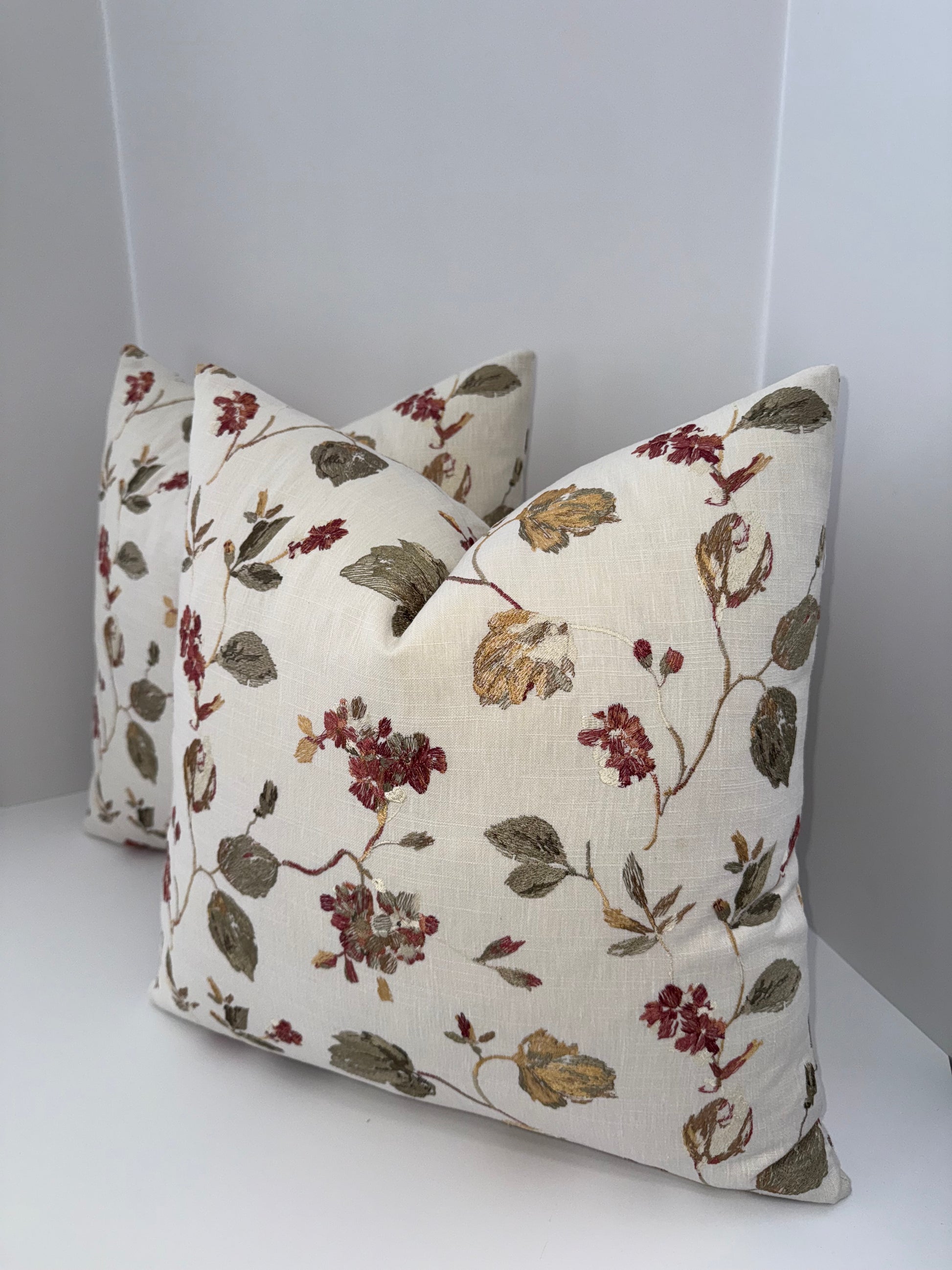 Two 20x20 White, Green, Red Floral Embroidered Decorative Pillows