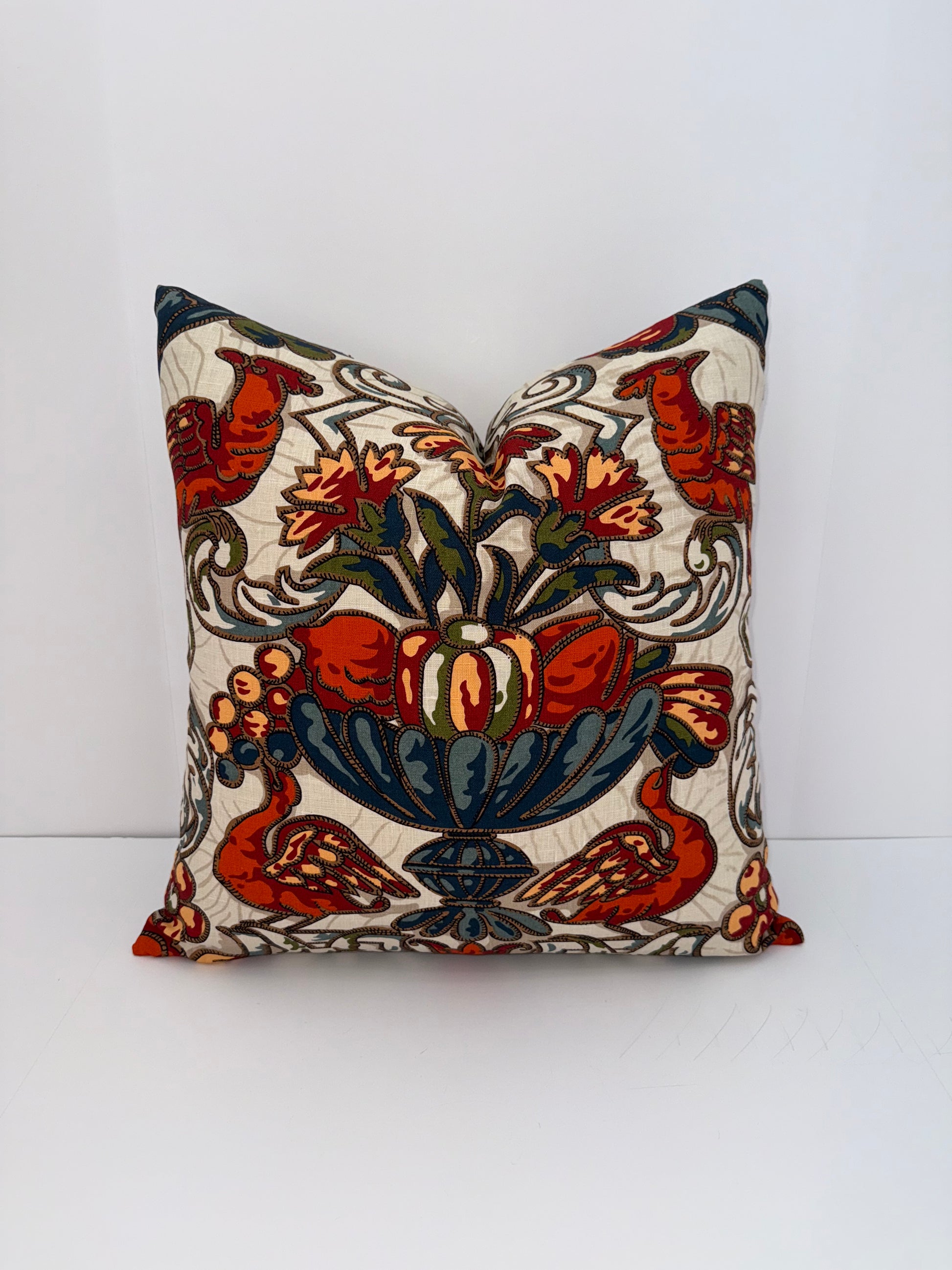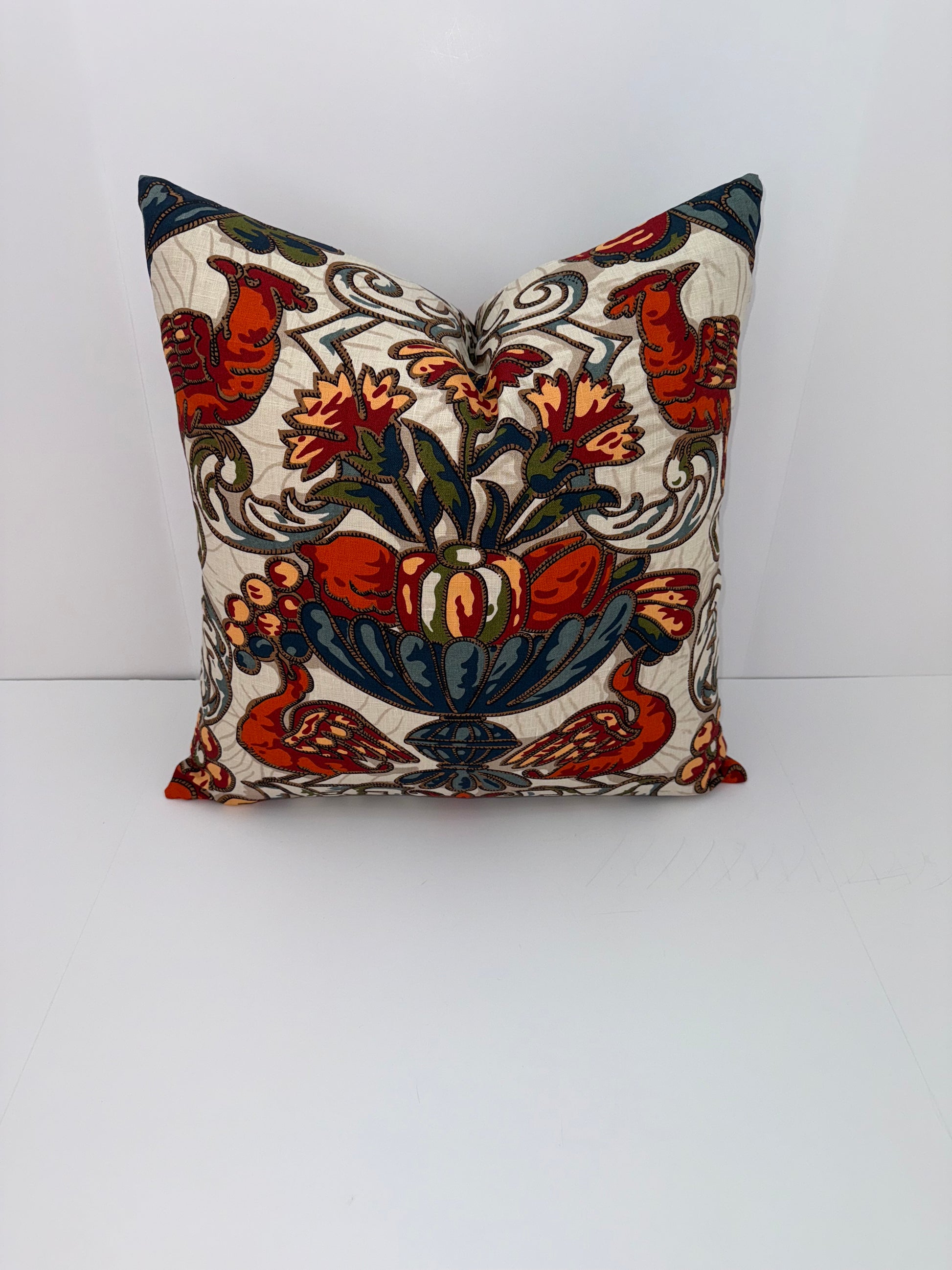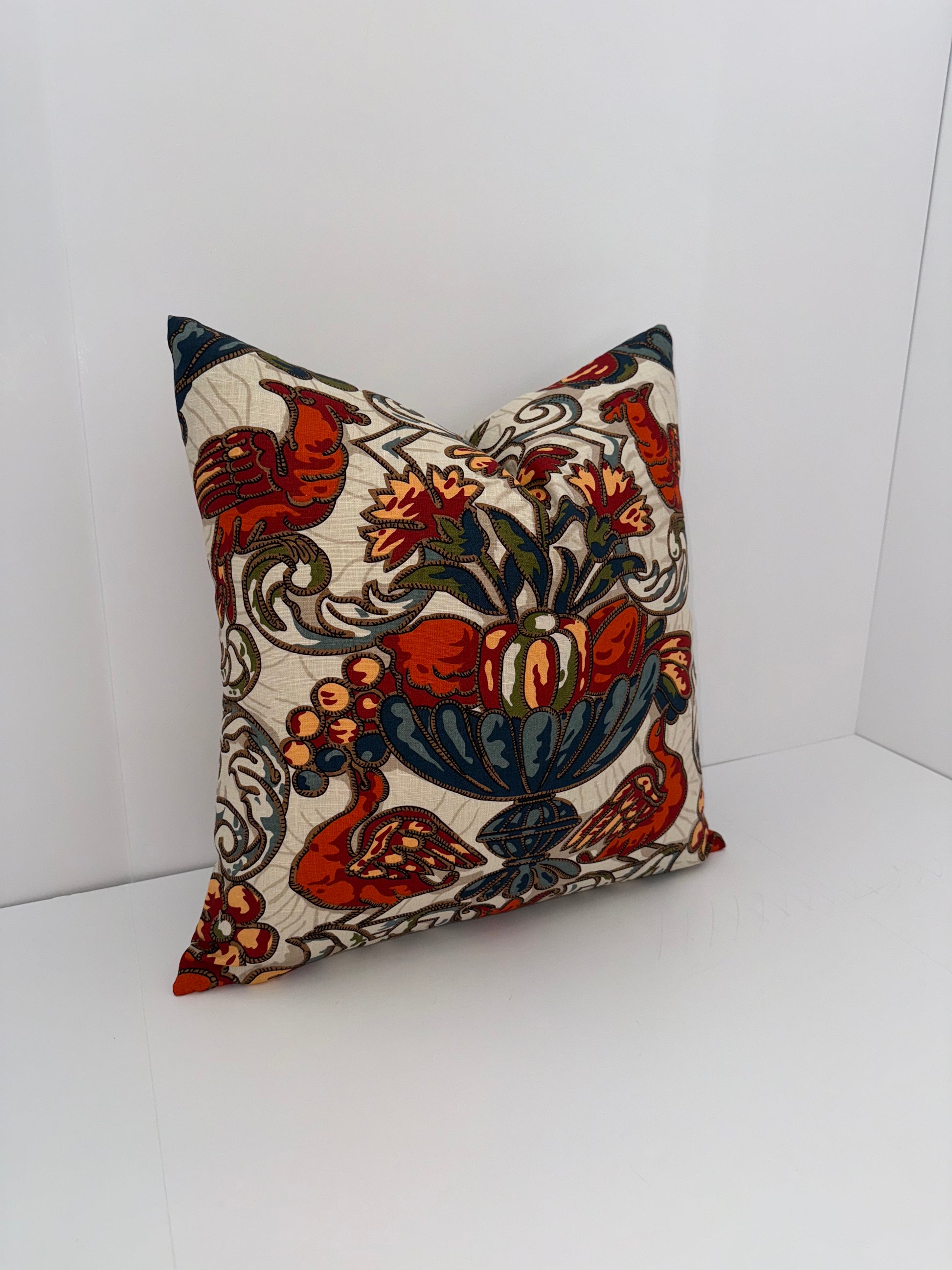 One 22x22 Blue, Beige, Orange, Red, and Green Printed Linen Decorative Pillow