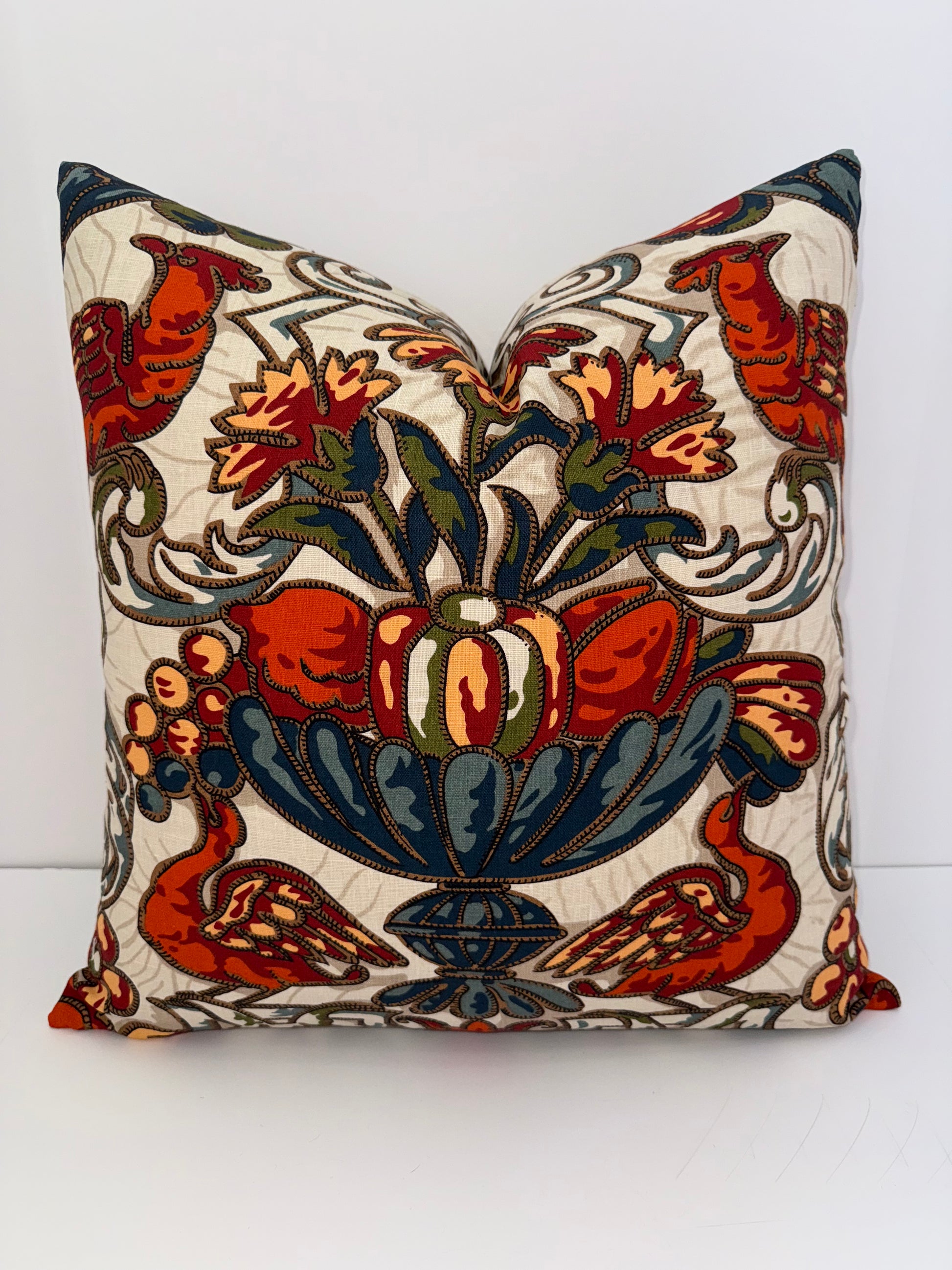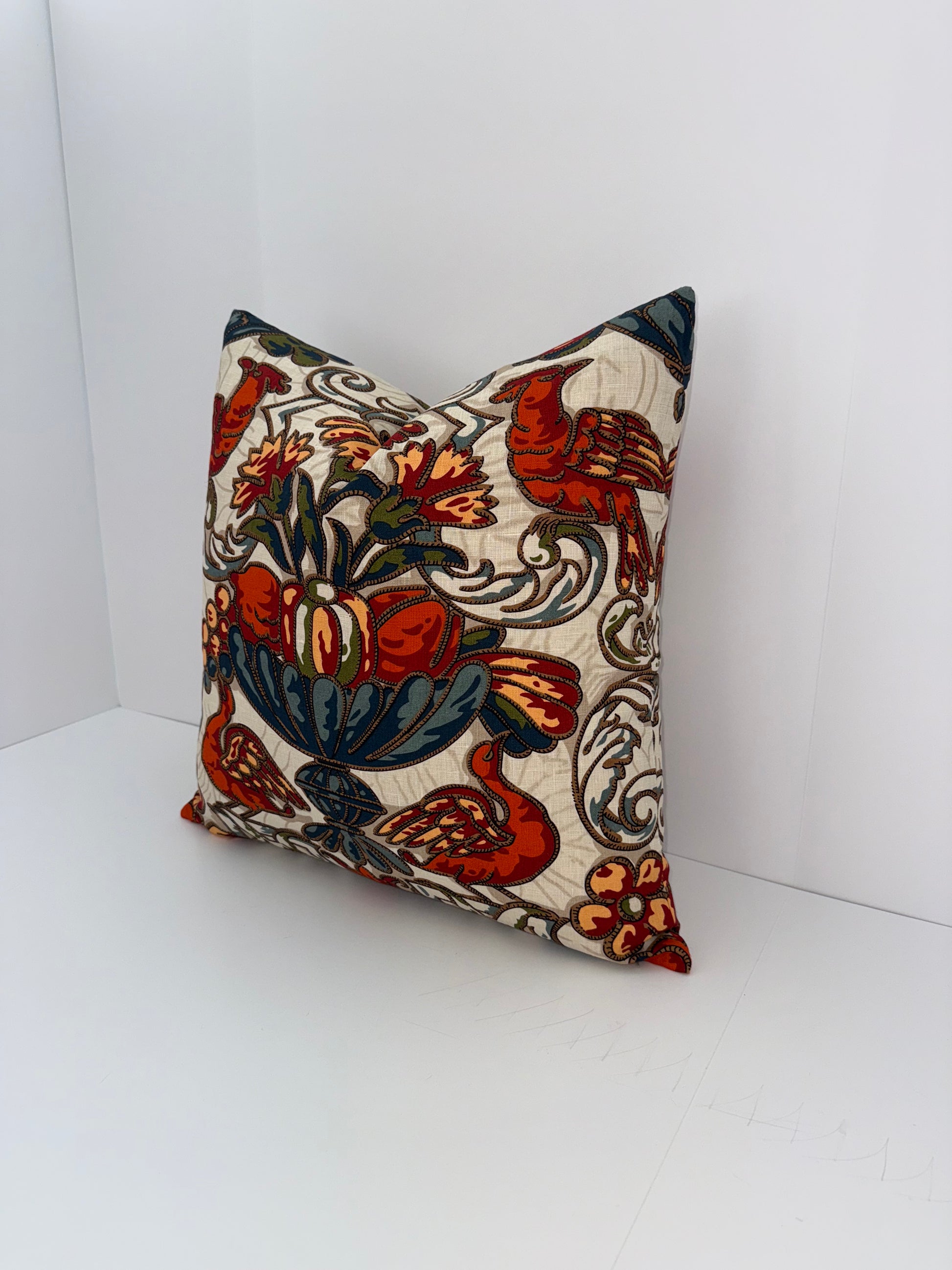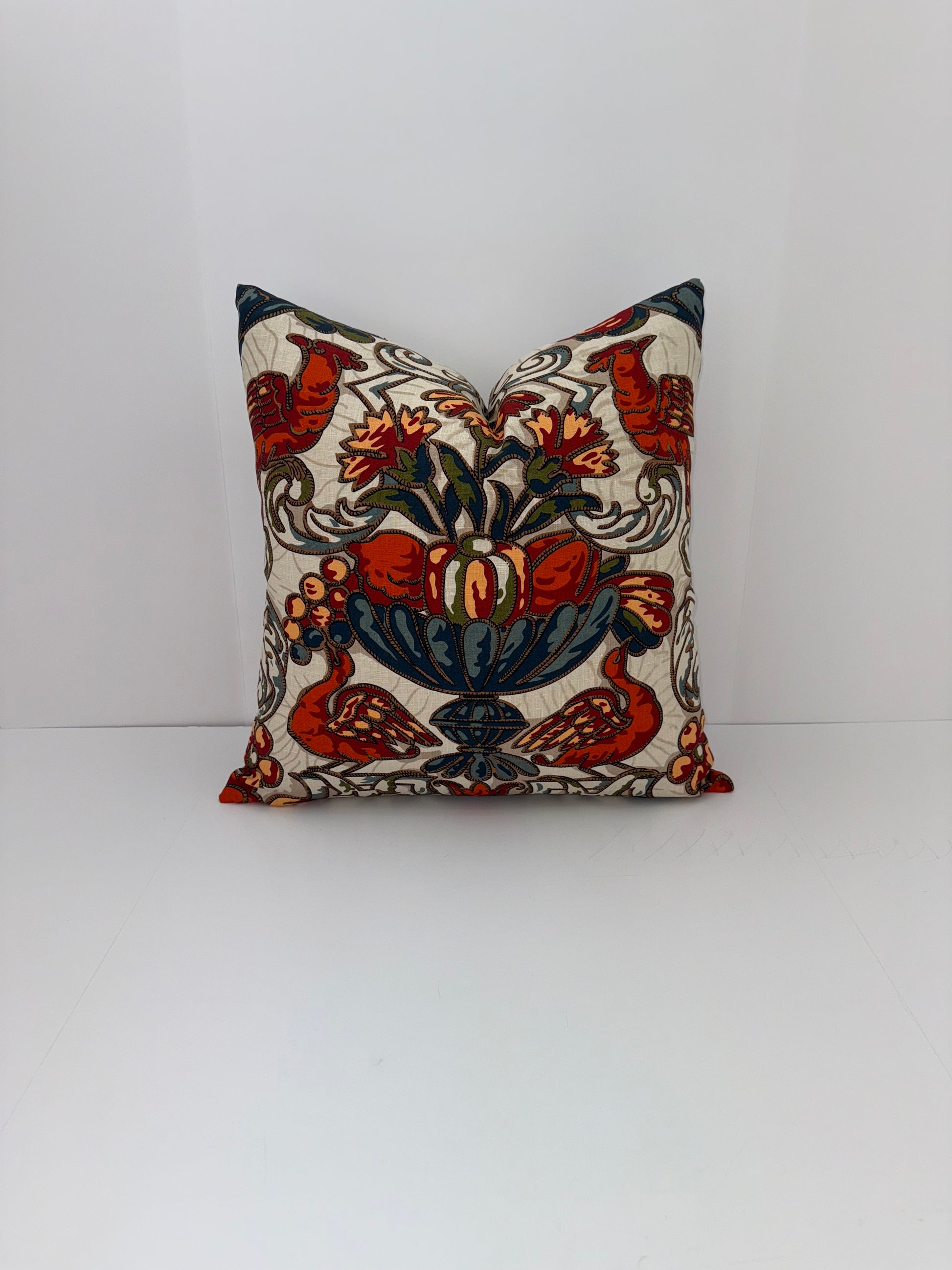 One 22x22 Blue, Beige, Orange, Red, and Green Printed Linen Decorative Pillow