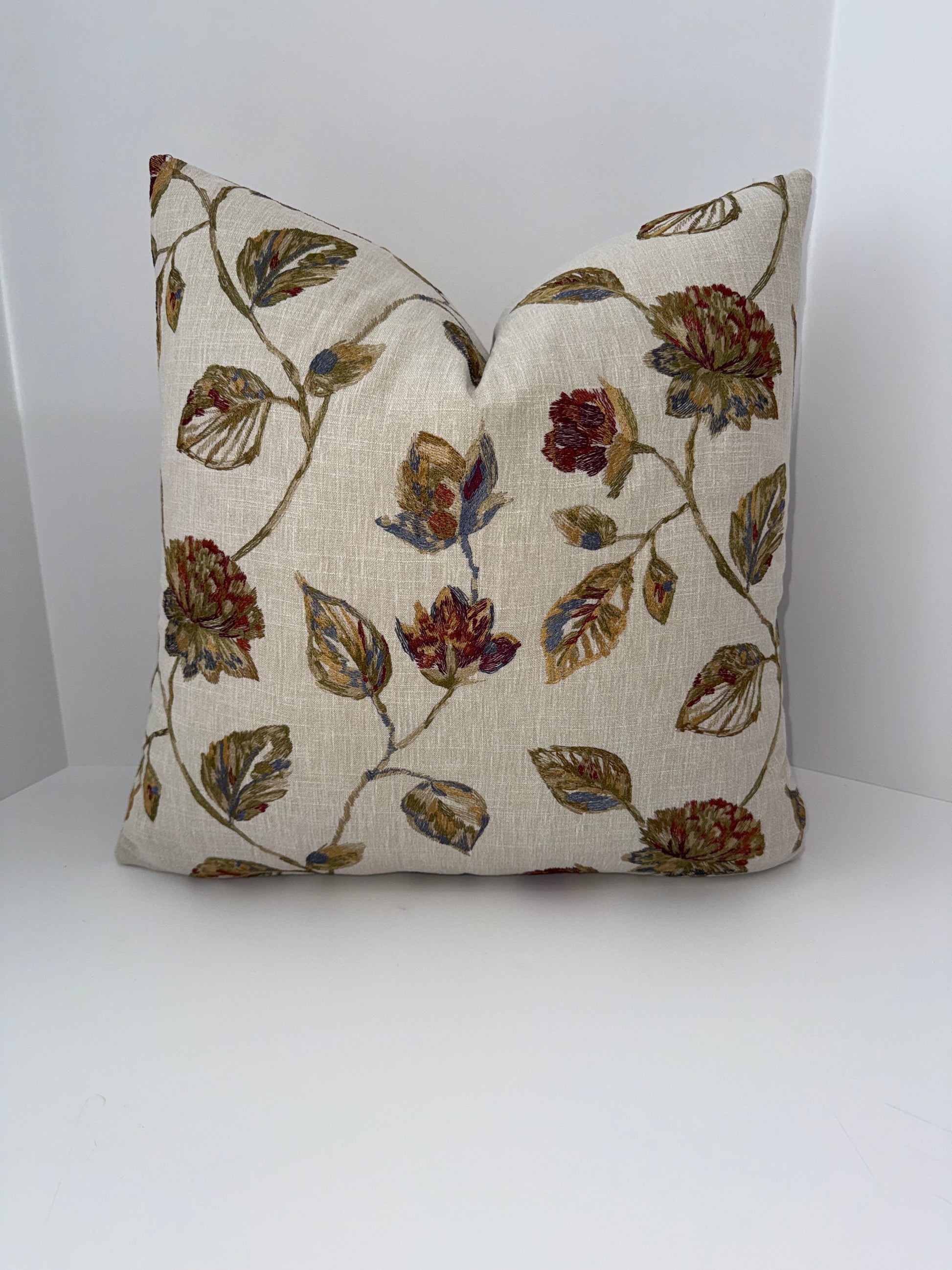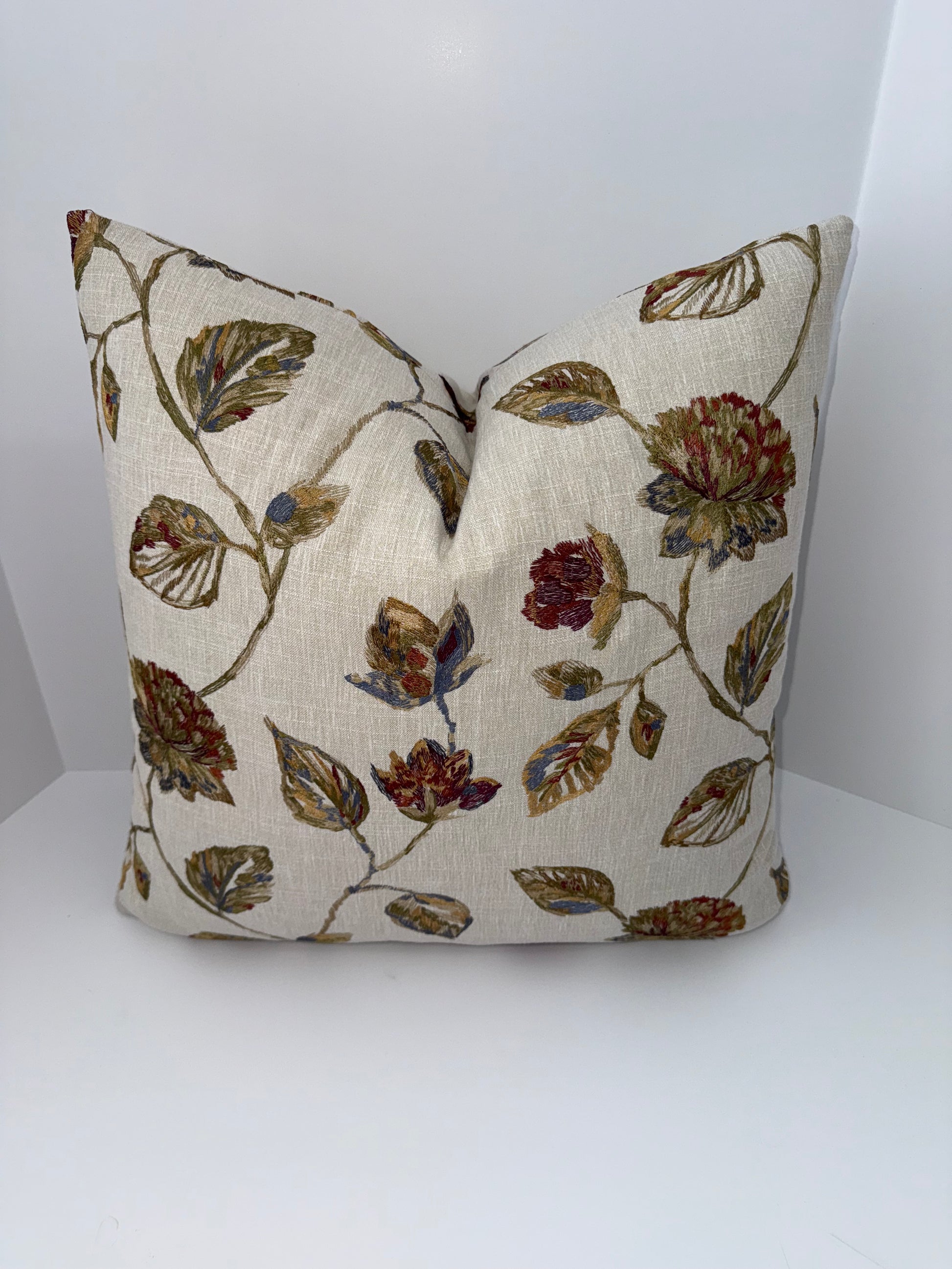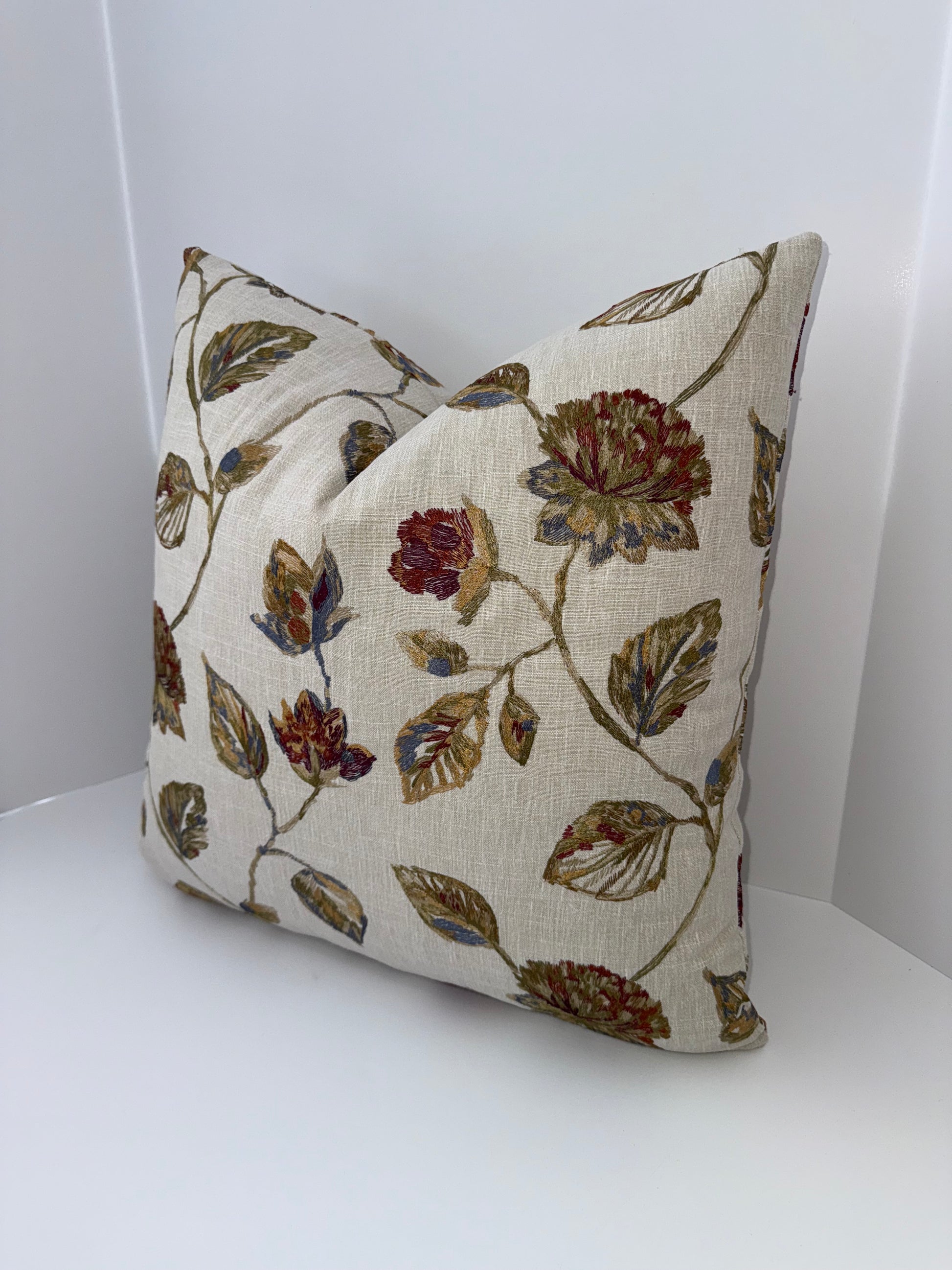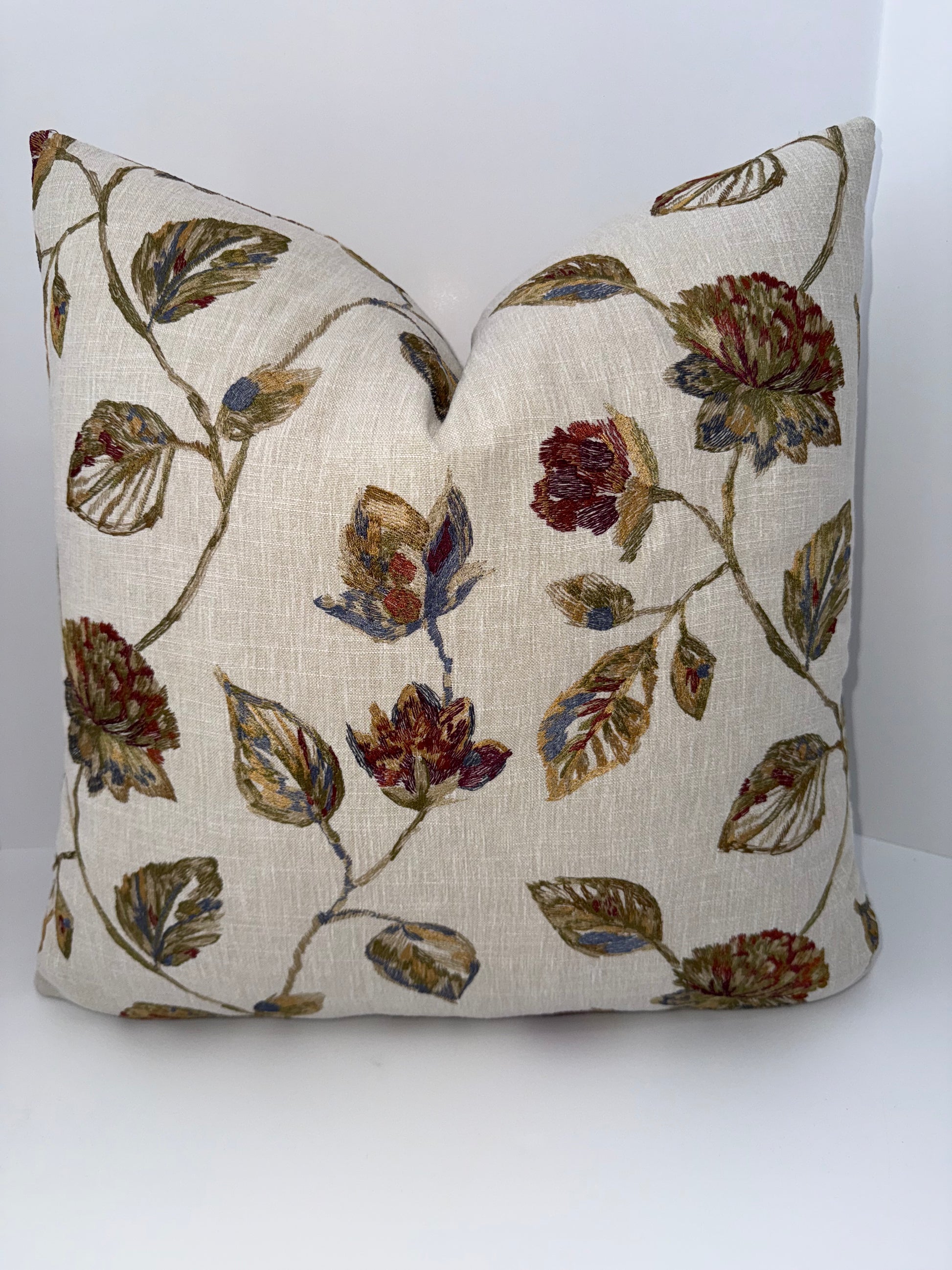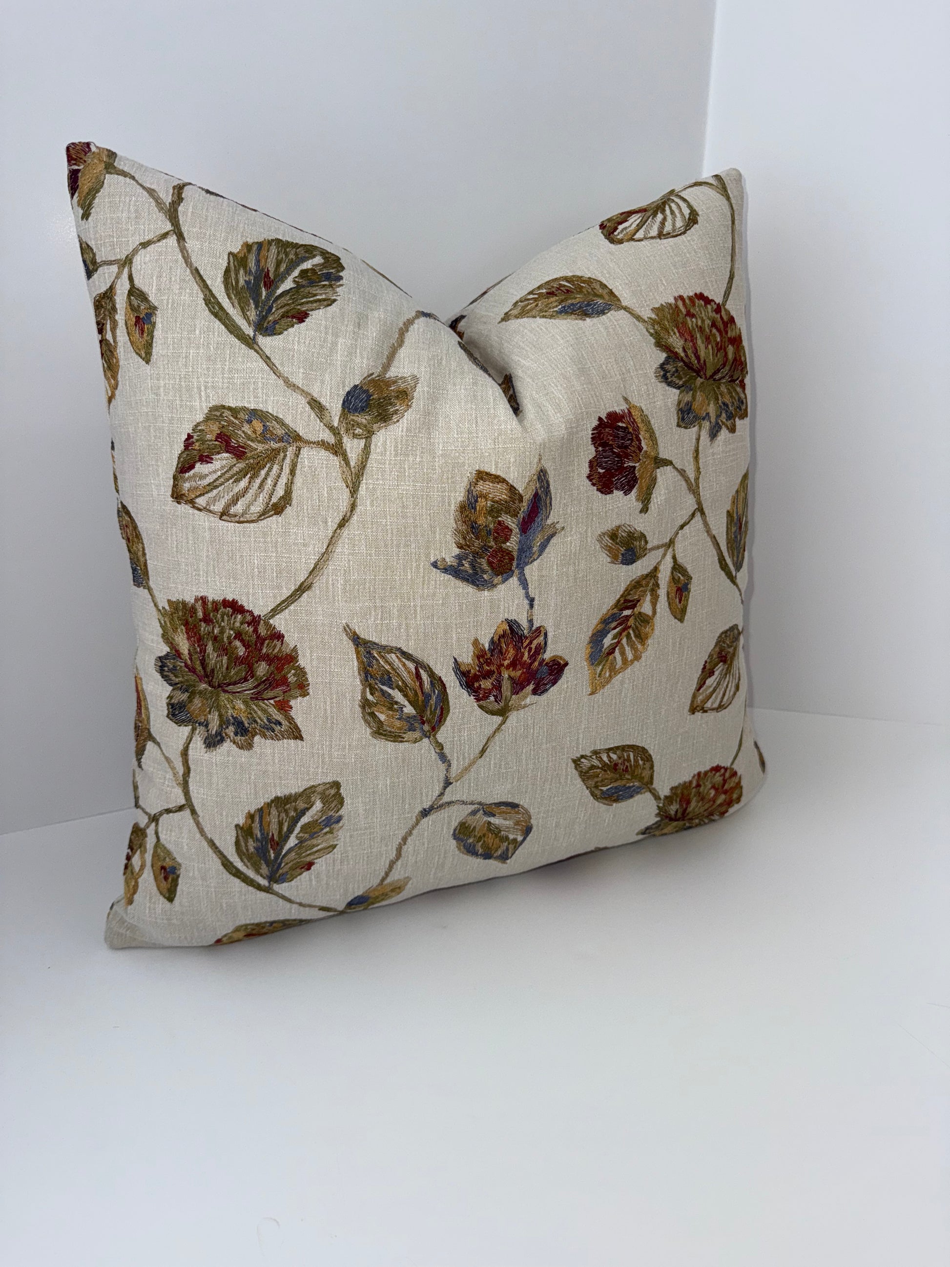 One 20x20 Beige, Red, and Blue Embroidered Linen Decorative Pillow