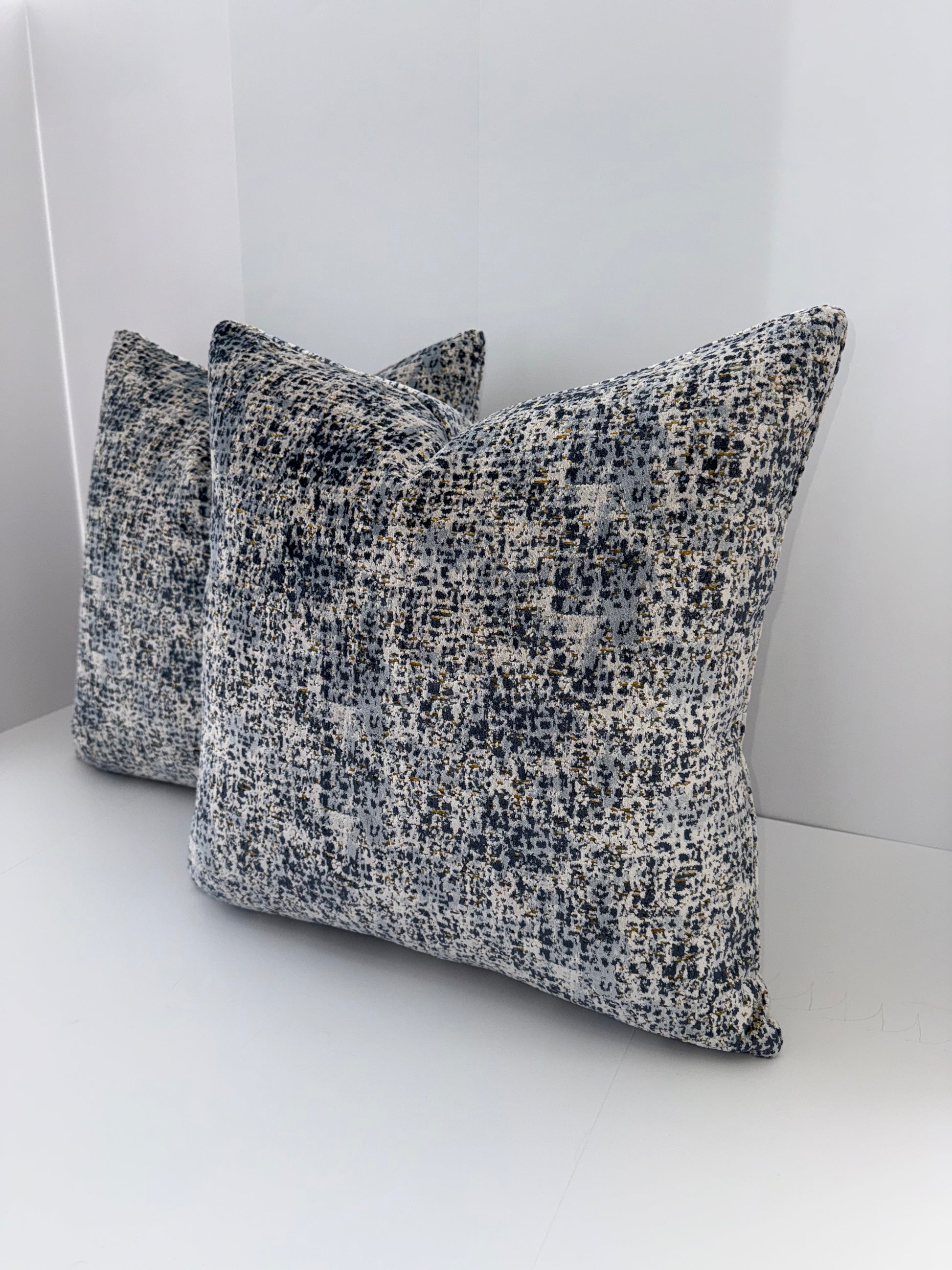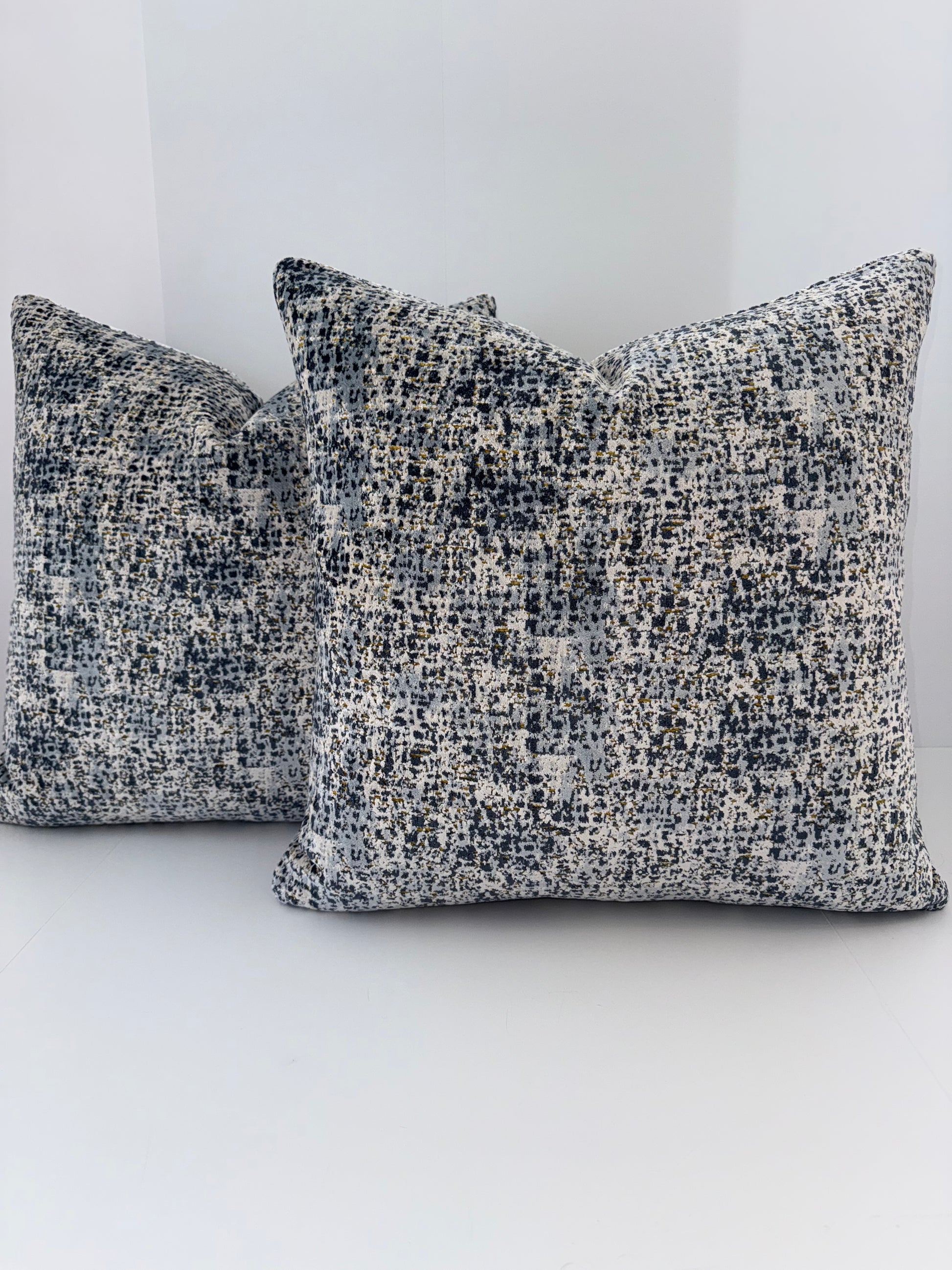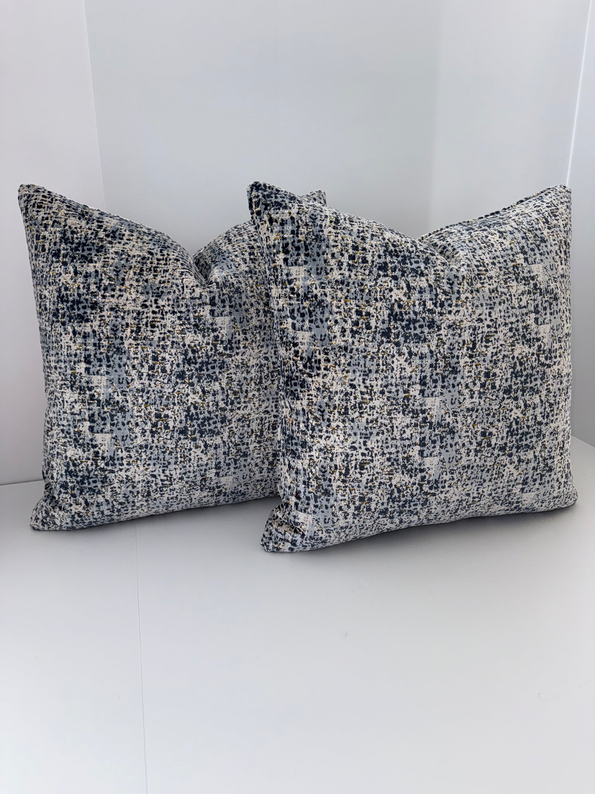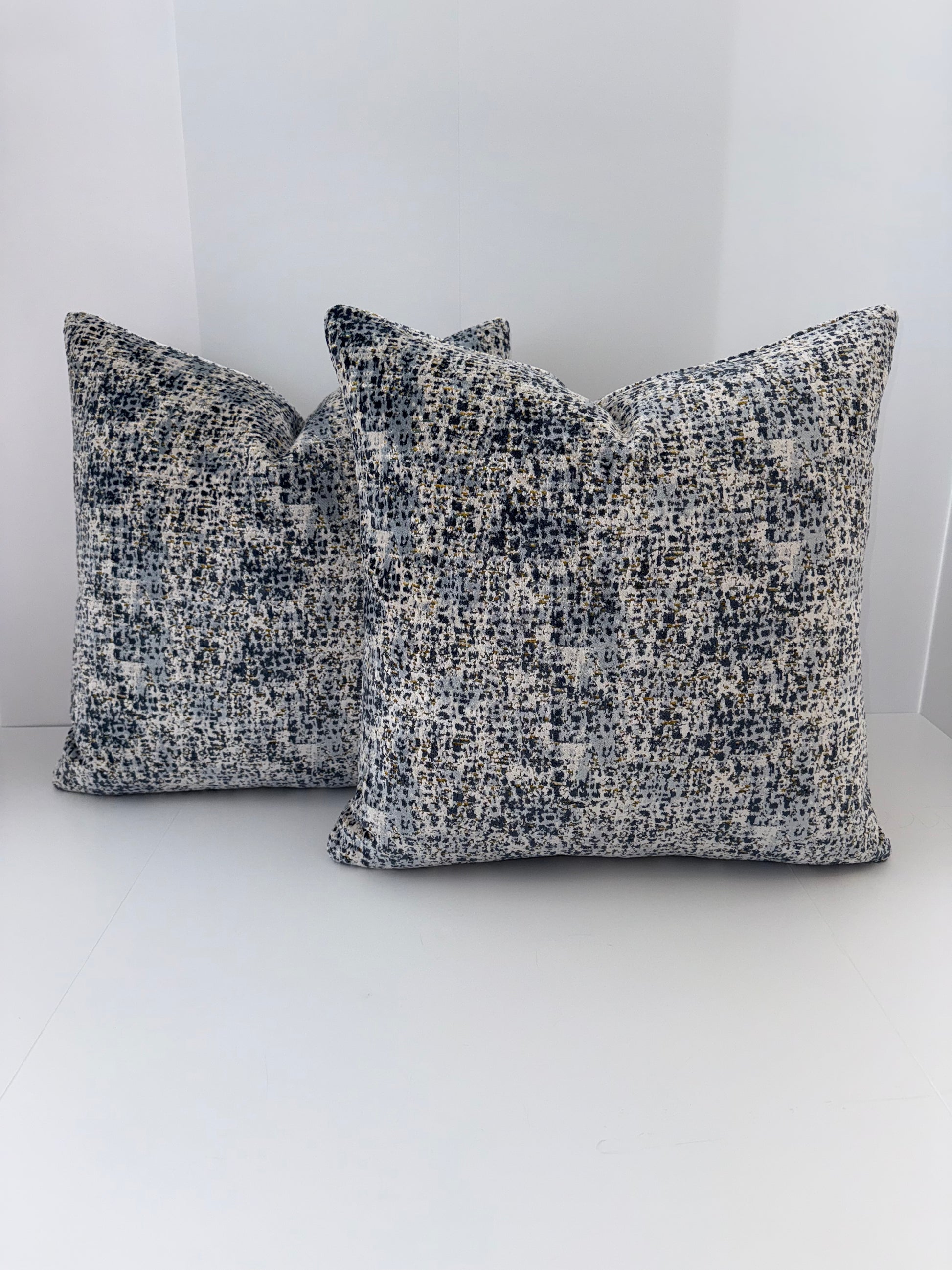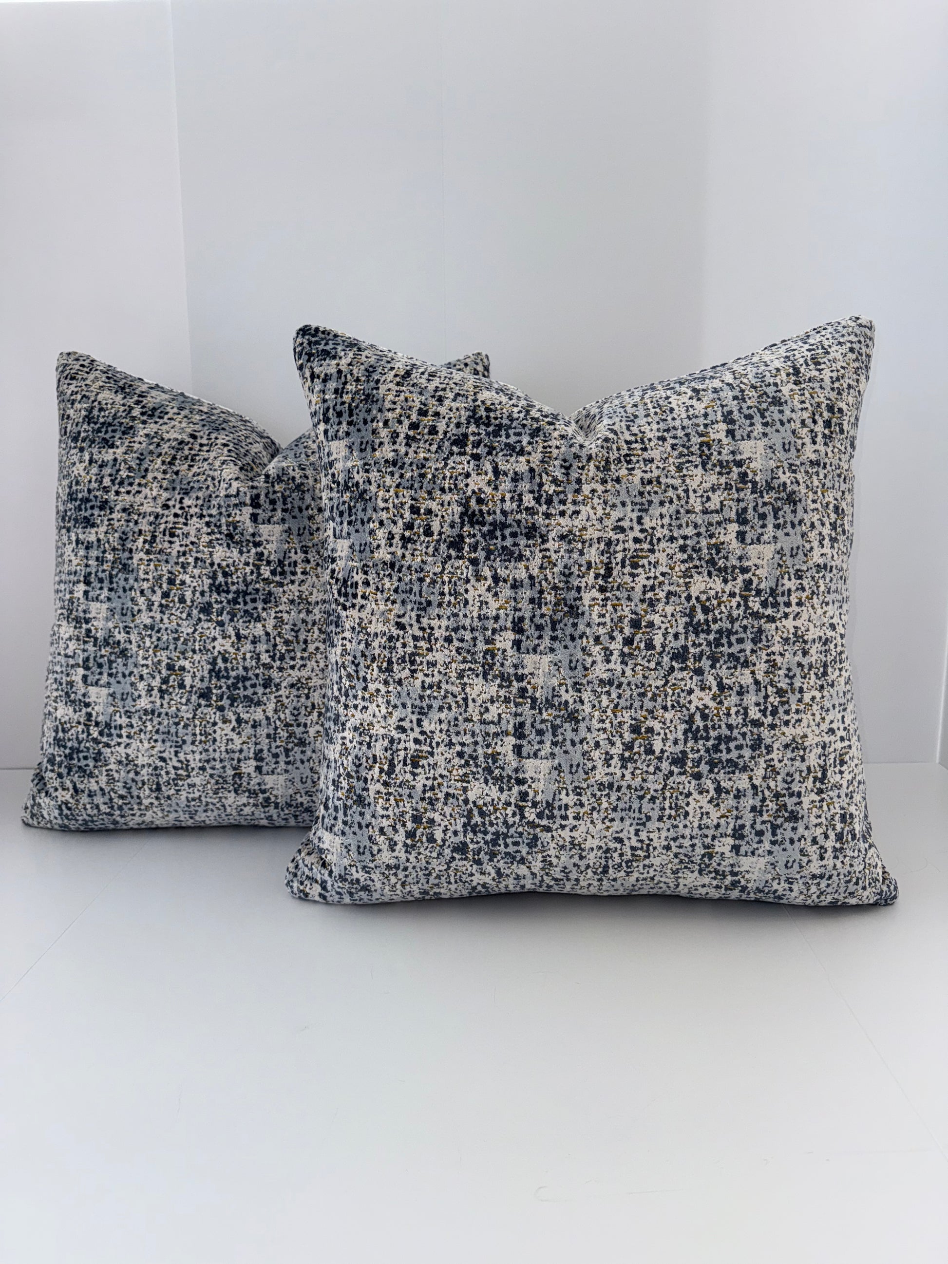 Two 22x22 Blue, White, and Yellow Velvet Decorative Pillow