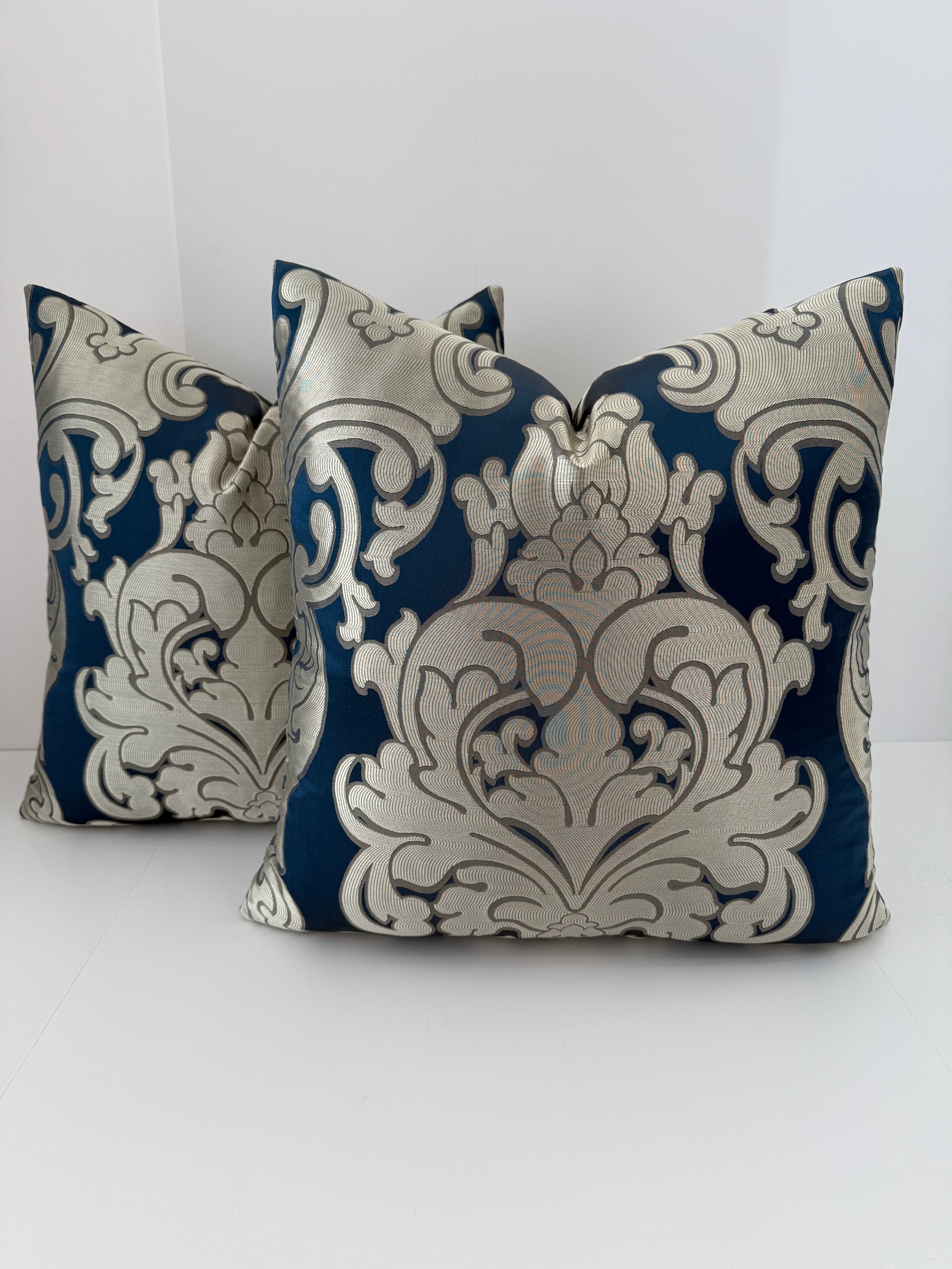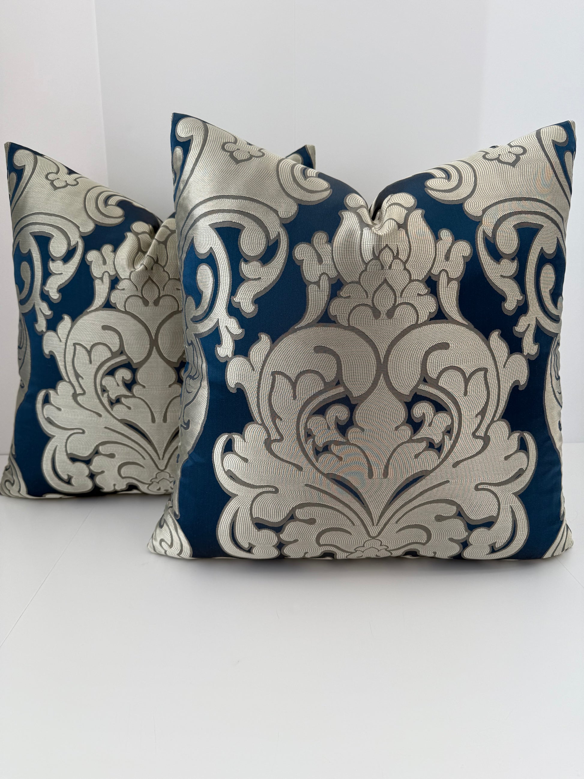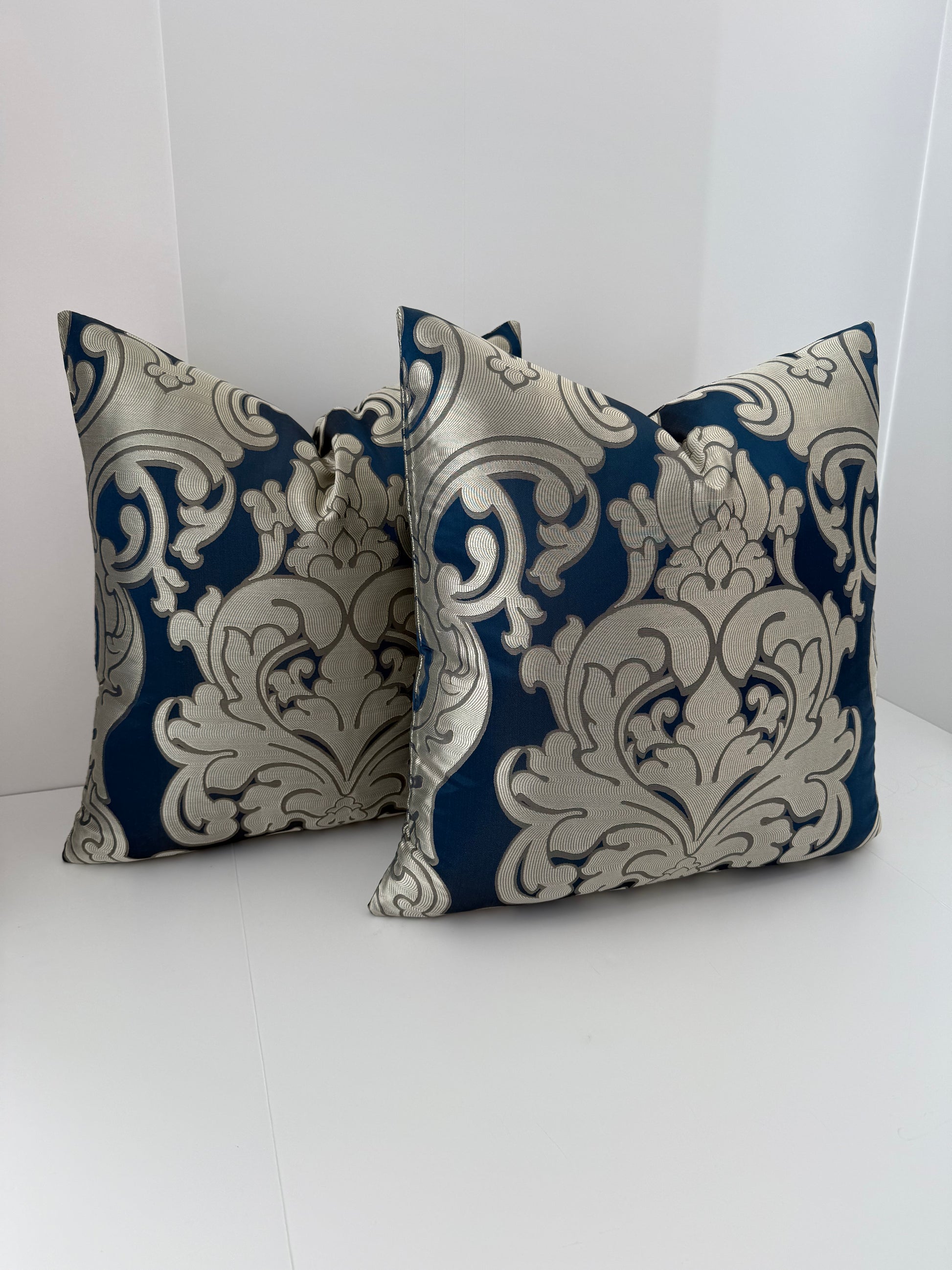 Two 22x22 Gold and Blue Silk Decorative Pillows