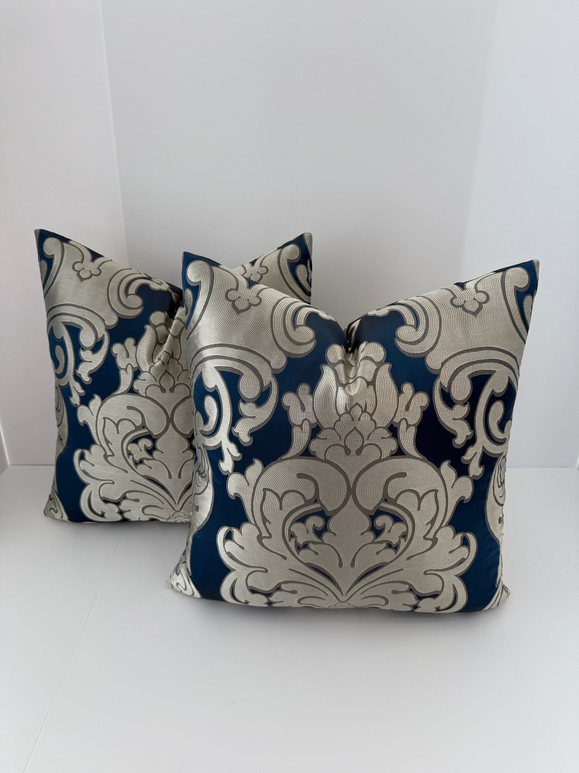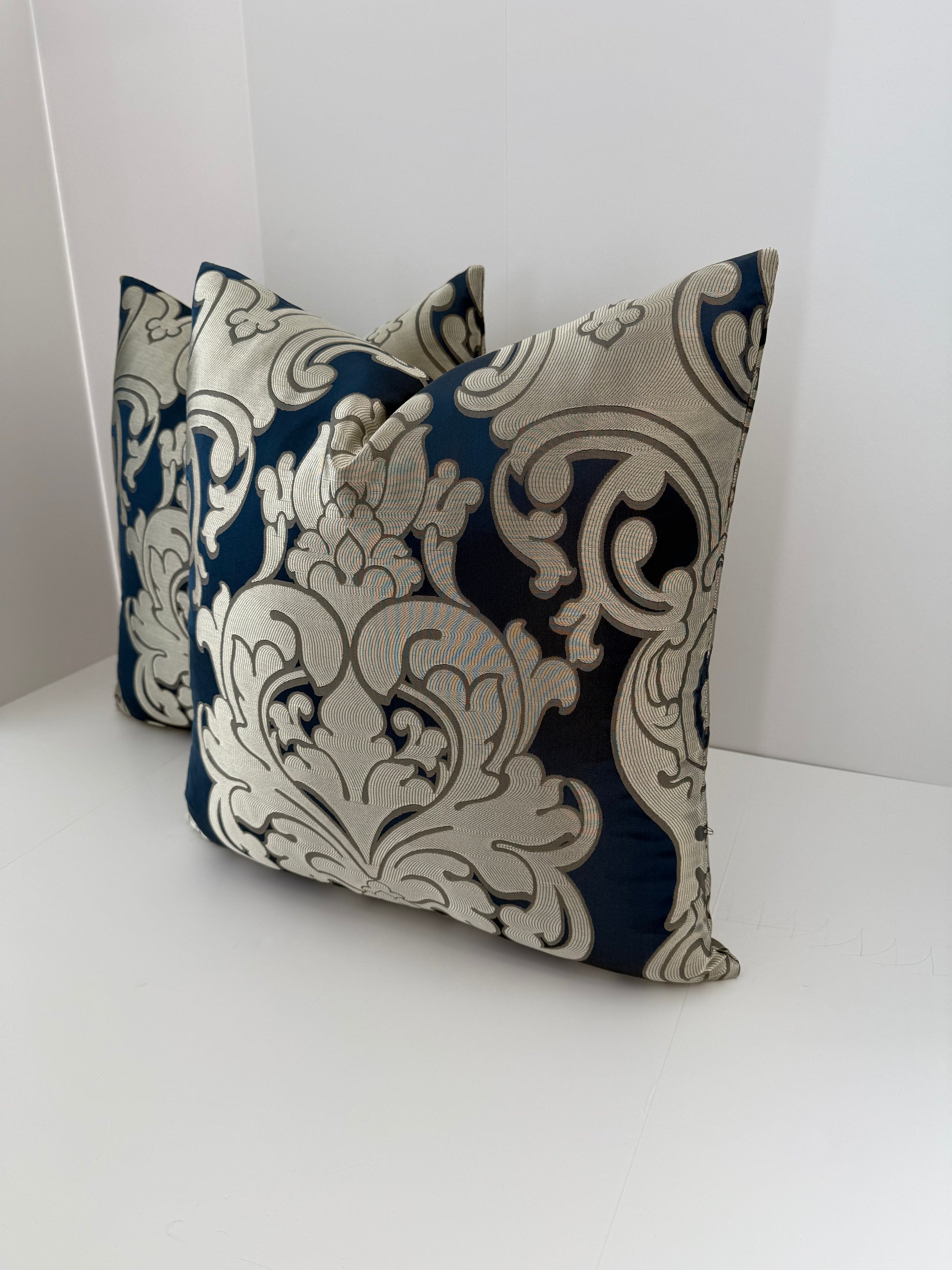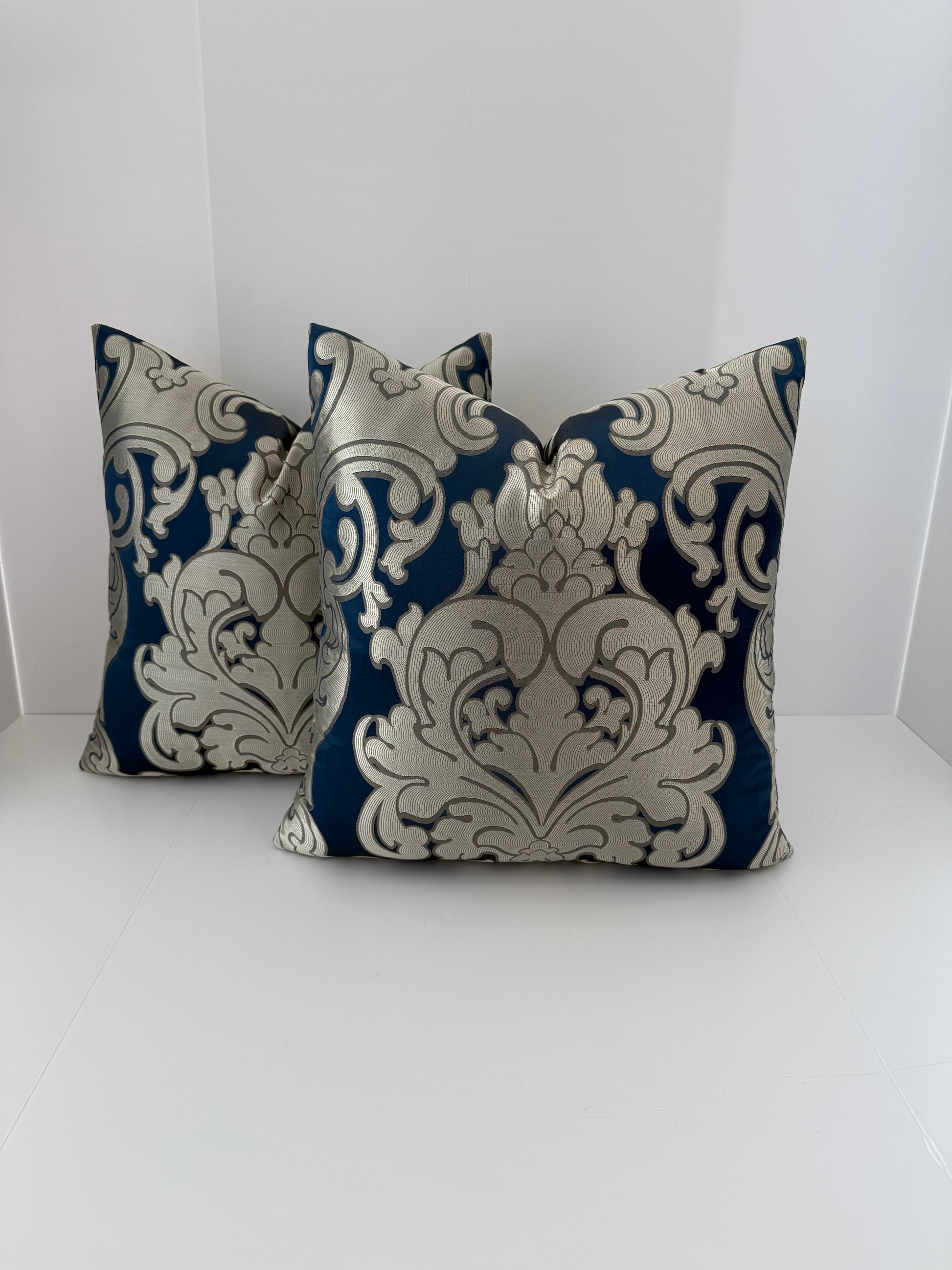 Two 22x22 Gold and Blue Silk Decorative Pillows